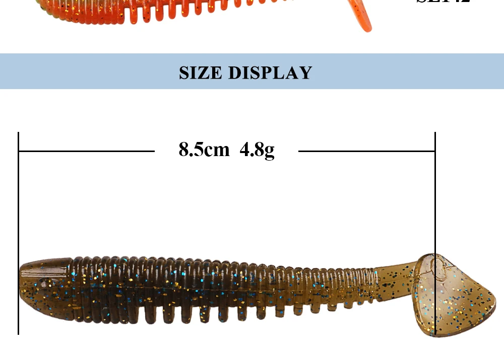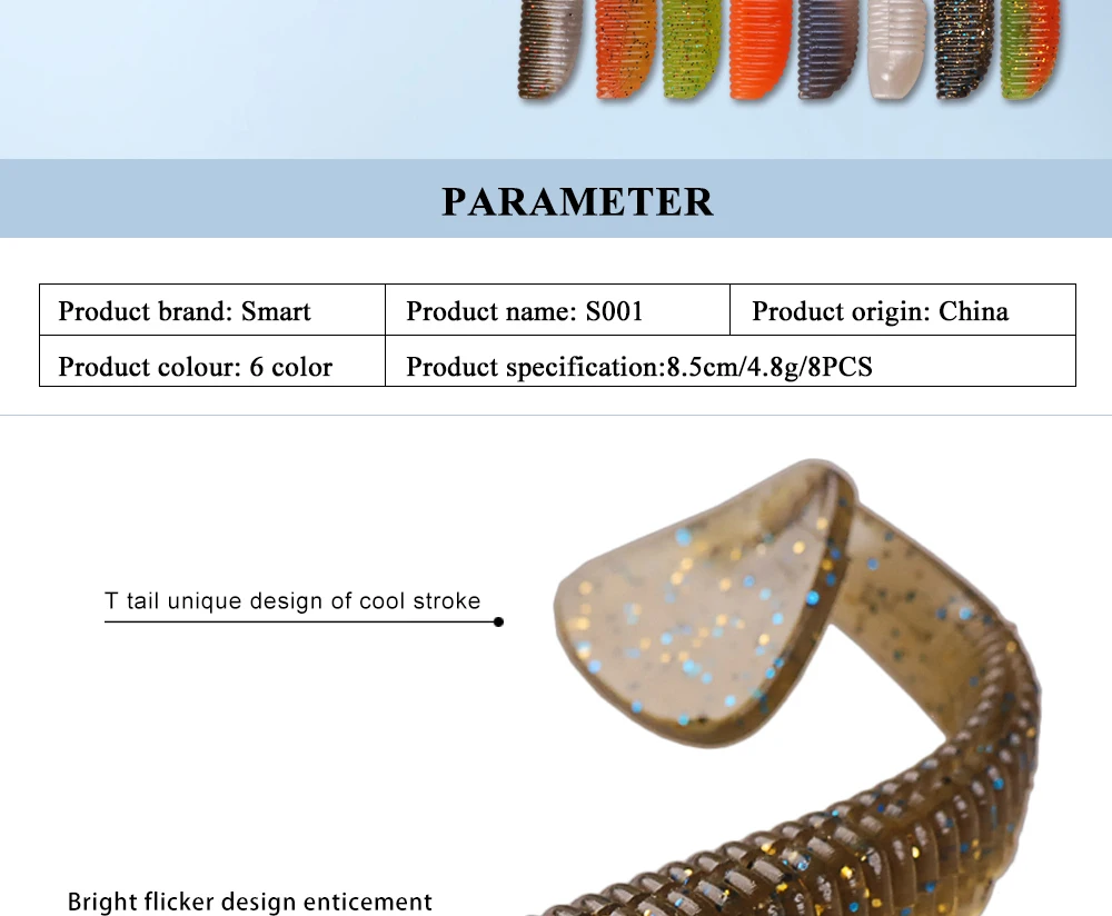 Смарт-приманки для ловли рыбы, 8 шт. 85 мм 4,8 г искусственные приманки T хвост воблеры свимбейт, мягкие приманки для Шад Карп силиконовые рыболовные приманки мягкие приманки рыболовные снасти Спецификация: 1. Бренд: smart 2. Тип: Мягкая приманка 3. Длина: 85 мм 4. Вес: 4,8 г 5. Посылка: 8 шт./пакет 6. Материал: силикон Особенности: 1. Внутренний полой паз обеспечивает дополнительную гибкость. 2. Реальный дизайн привлекает больше атак. 3. Боковая резинка обогащает плавание новыми привлекательными нюансами. 4. Гениальный дизайн корпуса обеспечивает исключительные эксплуатационные характеристики. Посылка входит: 8 мягких приманок
