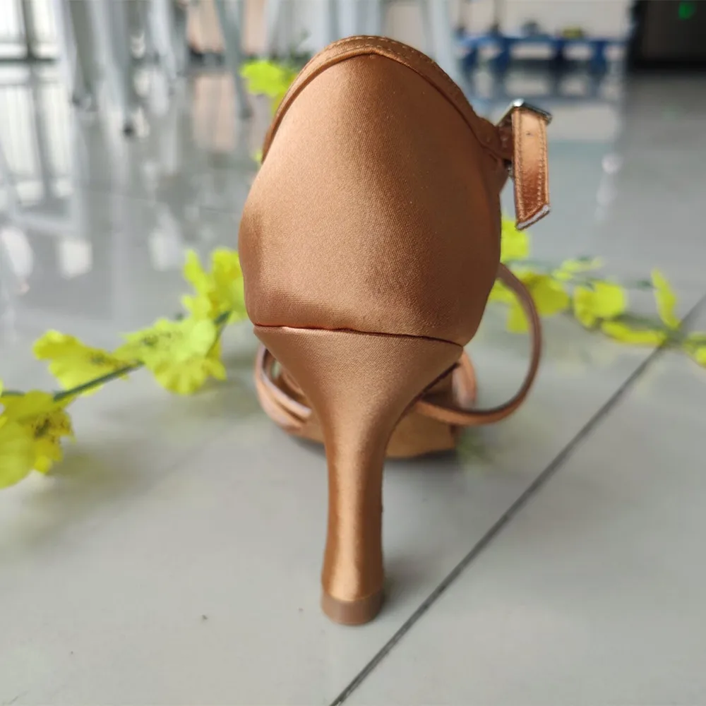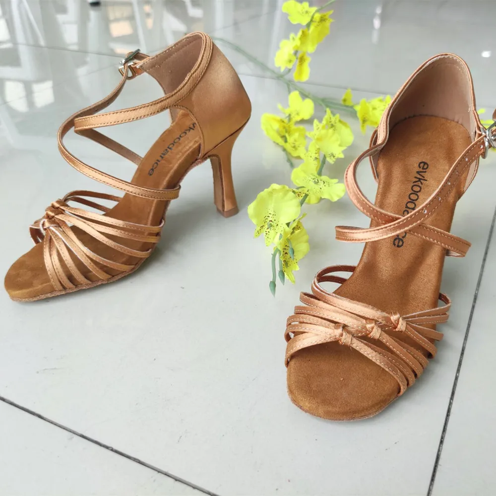 АТ Танцы светло-коричневые Цвет 8,3 см высокий каблук Туфли для латинских танцев Танцы обувь для дам Новинка 2017 года; стильное платье с Удобная сатиновая Материал Evkoo-020