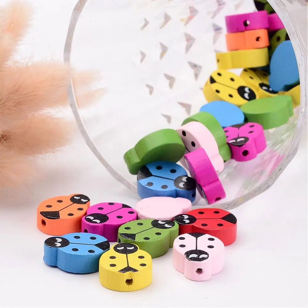 50 шт Смешанные без свинца Божья коровка деревянные бусины, окрашенные