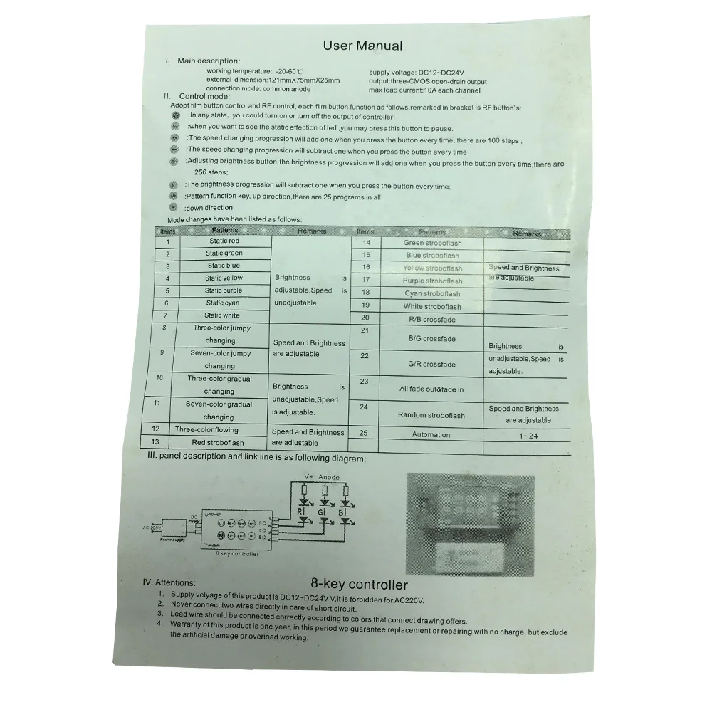 Входное напряжение: DC12V-24V Максимальная нагрузка: 144 Вт (DC12V), 288 Вт (DC24V) Пульт дистанционного управления RF Частота: 433 МГц Удаленное расстояние: 20-30 м Режим: 25 видов. Размер: 12x7.5x2.5cm Вес брутто: 0,3 кг