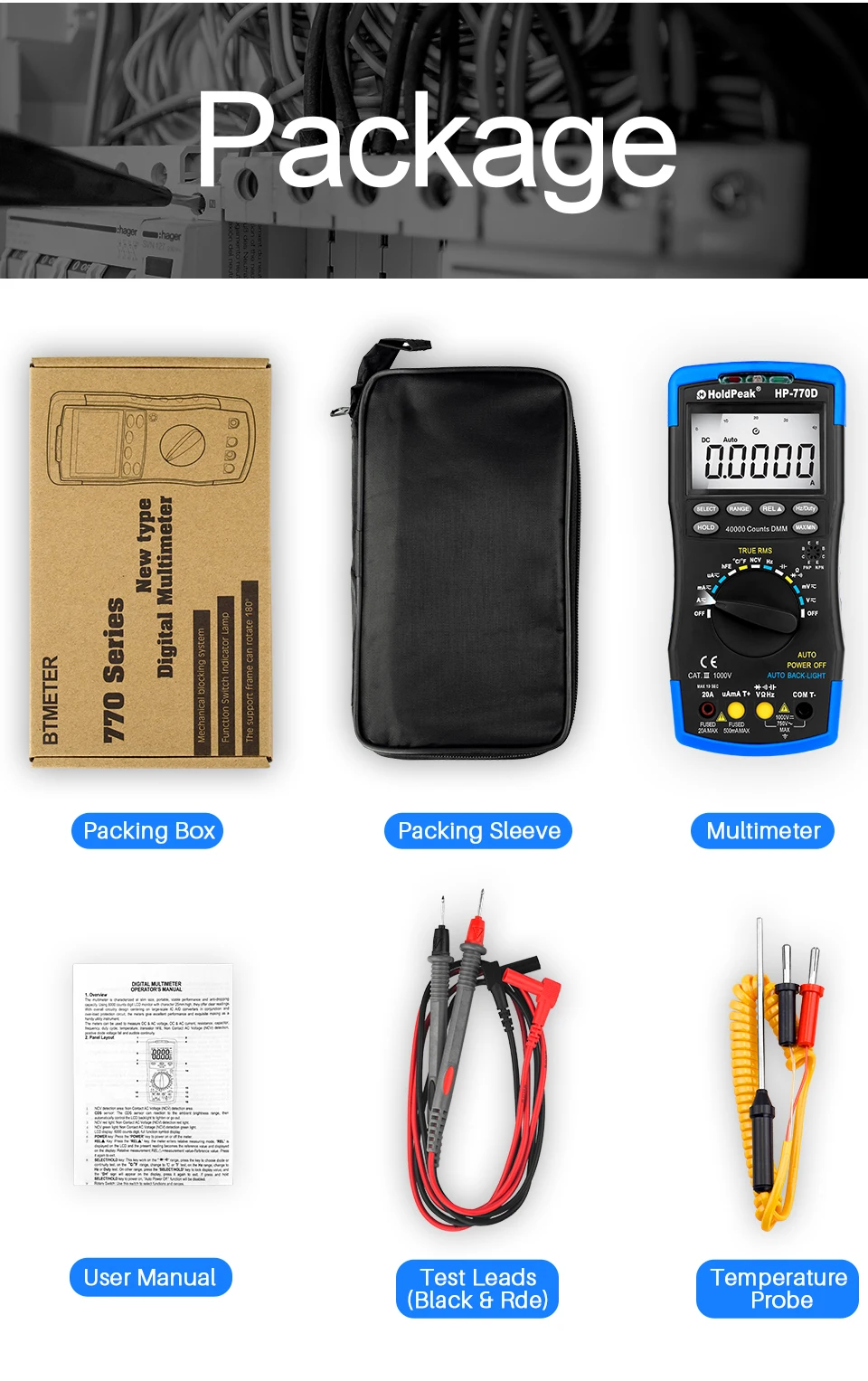 -Цифровой мультиметр HoldPeak HP-770D x1 -Руководство пользователя на английском языке x 1 -Тестовые провода x1 -Датчик Температуры x 1