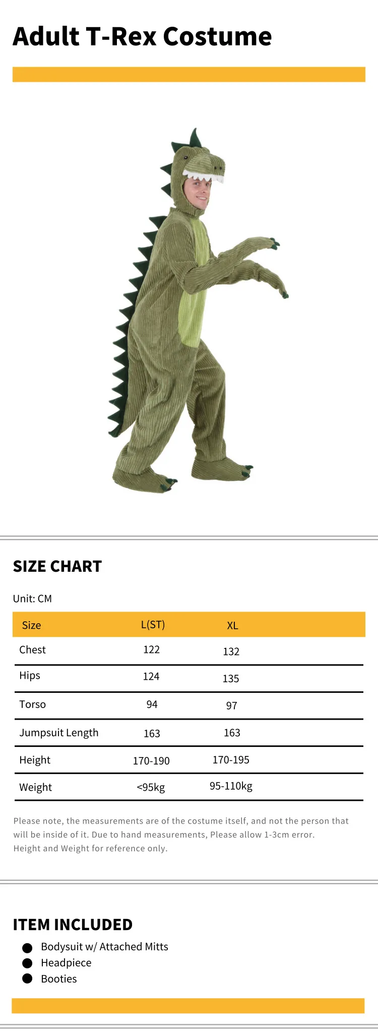 Знаете ли вы, что некоторые палеонтологи считают это T. У Рекса были перья по крайней мере на части тела? Они также спорят, действительно ли это Хищник или просто Мусорщик. В любом случае, это был один из последних и самых больших динозавров. Вы можете стать одним из них в этом костюме для взрослых T-Rex. Хотя это может быть или не может быть полностью точно в истории, мы можем гарантировать, что вы будете иметь Доисторическое хорошее время! Вельветовые и флисовые ткани; пенопластовая набивная флисовая чешуя на спине и хвосте комбинезона, а также рукавицы на молнии, пришитые к манжетам, складываются назад, чтобы разоблачить руки, головной убор крепится на липучке под подбородком, мягкая скульптура динозавра, зубцы и шипы на верхней части и задней части капота пены бахилы имеют ребристые трикотажные лодыжки манжеты, Эластичная лента под стопой также доступна для малышей, детей и больших размеров