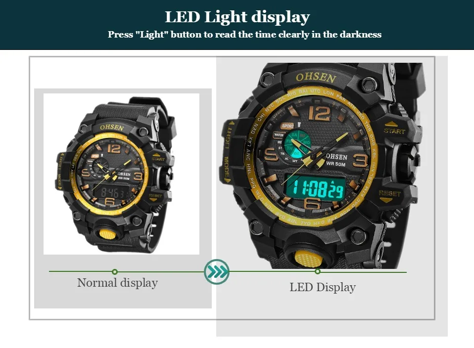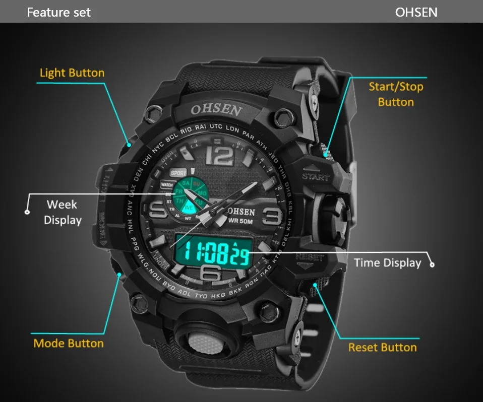 С двумя часовыми поясами Дисплей Цифровой: часы, минуты, секунды, вечера, месяц, дата, день 12/24 формата отображения времени Цифровой светодиодный дисплей, нажмите кнопку «светильник», чтобы четко видеть время в темноте Сигнализация и функция почасового звонка Специальная конструкция с хронограф (секундомер) при температуре не выше 0,01 второй шаг На водонепроницаемость на глубине до 50 м (не нажимайте кнопки в воде) Ударопрочная, подходит как для занятий спортом на открытом воздухе, так и для занятий в помещении