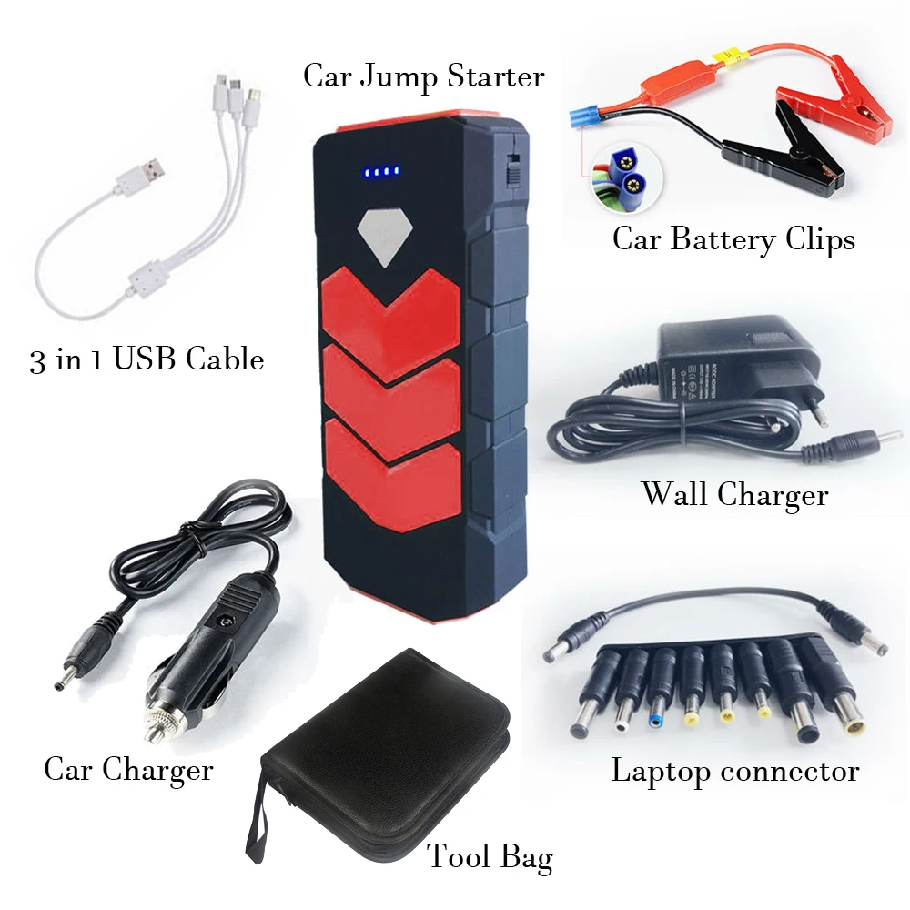 Стартер для автомобиля (внешний аккумулятор) * 1 Зажимы для аккумулятора (красный = Положительный; Черный = отрицательный) * 1 Настенное зарядное устройство * 1 Автомобильное зарядное устройство * 1 Usb-кабель для зарядки * 1 Разъем для ноутбука * 8 Зарядный кабель для ноутбука * 1 Инструкции на английском языке * 1 Чехол для розничного инструмента * 1