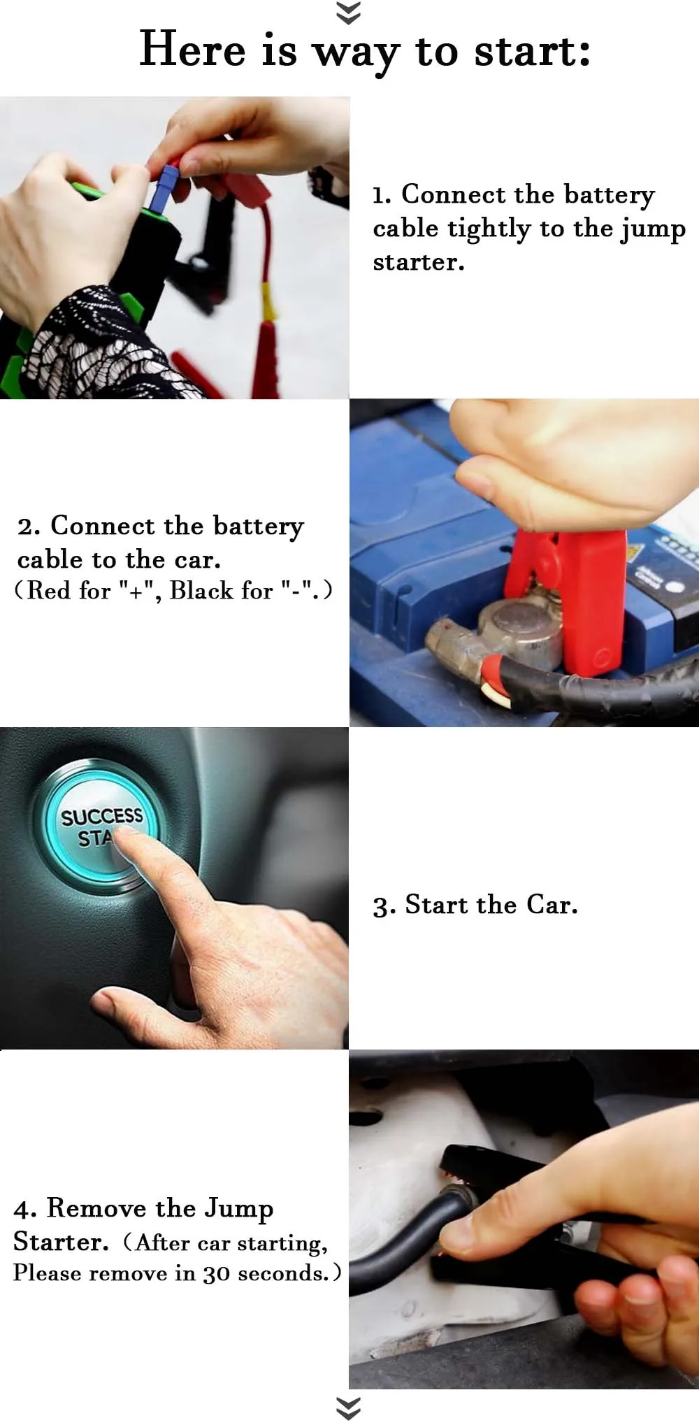 Номер модели: GG-JS-K11 Размер: L169 * W83 * H40 мм Вес мощности: 400 г Режим зарядки: CC/CA 15V 1A Выход: 5V/2A, 12V-16V/3.5A Напряжение автомобильной загрузки: 12 В Ток загрузки: 200A Пиковый ток: 400A Срок службы цикла загрузки: более 3000 раз Время полной зарядки: 4-6 часов Рабочее состояние: -20 ~ 65 градусов Цельсия