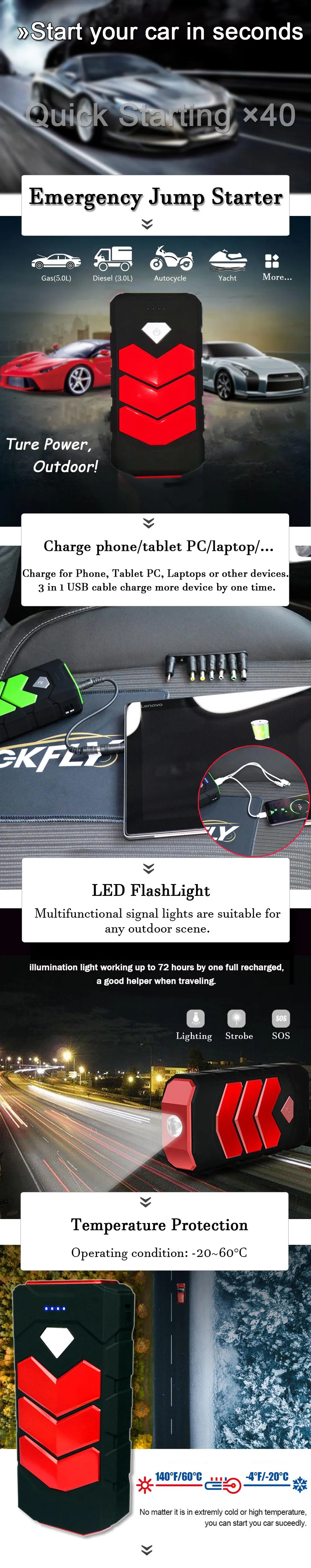 Запуск автомобиля (когда батарея автомобиля заканчивается) Зарядка мобильных телефонов (планшетный ПК/камера) Заряжайте Ноутбуки (другие устройства) Фонарик/SOS огни