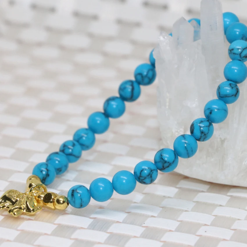 Бесплатная доставка позолоченная Милая Подвеска со свиньей синтетической бирюзой 6 мм синие круглые бусины дизайн браслет ювелирные изделия 7,5 дюйма B2105 ![]()
