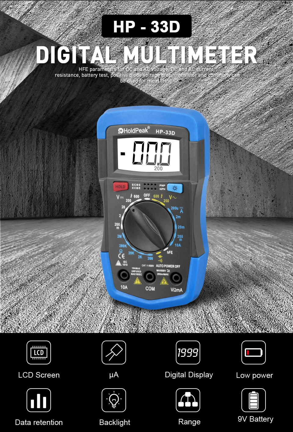 Подробная информация о продукте: Наименование товара: Цифровой мультиметр HoldPeak HP-33d Бренд: HoldPeak Основная функция: Ручной диапазон Тест напряжения постоянного/переменного тока Постоянного тока тесты Испытание на сопротивление Диод/Проверка коэффициента передачи (hFE) транзисторов Непрерывный звуковой сигнал Задний фонарь Автоматического отключения Удержания данных