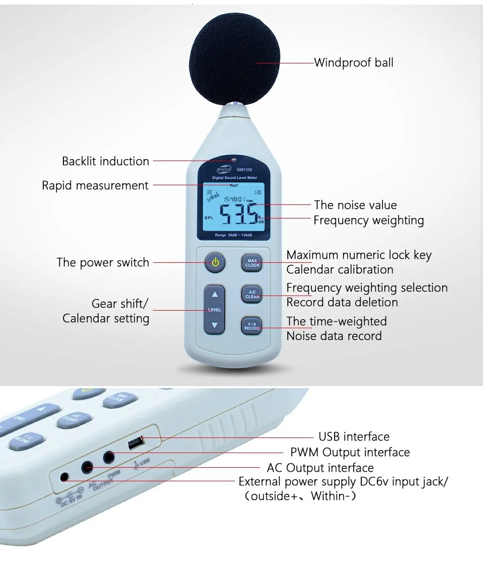 BENETECH GM1356 Цифровой измеритель уровня звука USB измеритель шума 30-130dB A/C быстрый/медленный dB + программное обеспечение