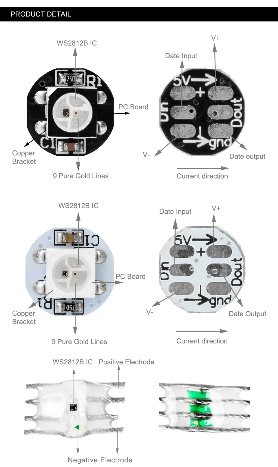 Примечание: WS2812B светодиодный модуль должен использовать DC5V источник питания, И должно быть нужно управление светодиодным контроллером! Характеристики: Для Батарея набор в коробке, он будет работать с 3 предмета в комплекте 1,5 V AA Батарея. (Мы отправляем посылка без батареек). 1) Рабочее Входное напряжение: 5 в пост. Тока. 2) Выход мощность: 0,1 W/0,3 Вт/шт.. 3) Длина кабеля: около 6 метров/шнур. 4) излучаемый Цвет: 4020RGB, 5050RGB WS2812B. 5) Количество светодиодный: 50 светодиодный s/полоса, 50 пикселей/струна. 6) Длина волны (нм): R-650mcd, G-520mcd,B-460mcd. 7) сигнал: чип WS2812b 8) Степень защиты: не водонепроницаемый 9) Угол обзора: 120 градусов 10) Рабочая температура: -20 ~ 50 ° 11) Гарантия: 2 года