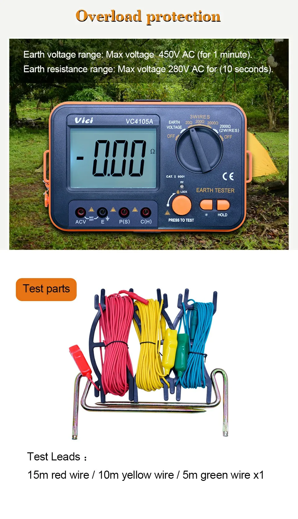 5. Защита от перегрузки: в диапазоне напряжения земли, максимальное напряжение может быть 450 в переменного тока (в течение 1 минуты). В диапазоне сопротивления заземления максимальное напряжение может быть 280 В переменного тока (10 секунд).