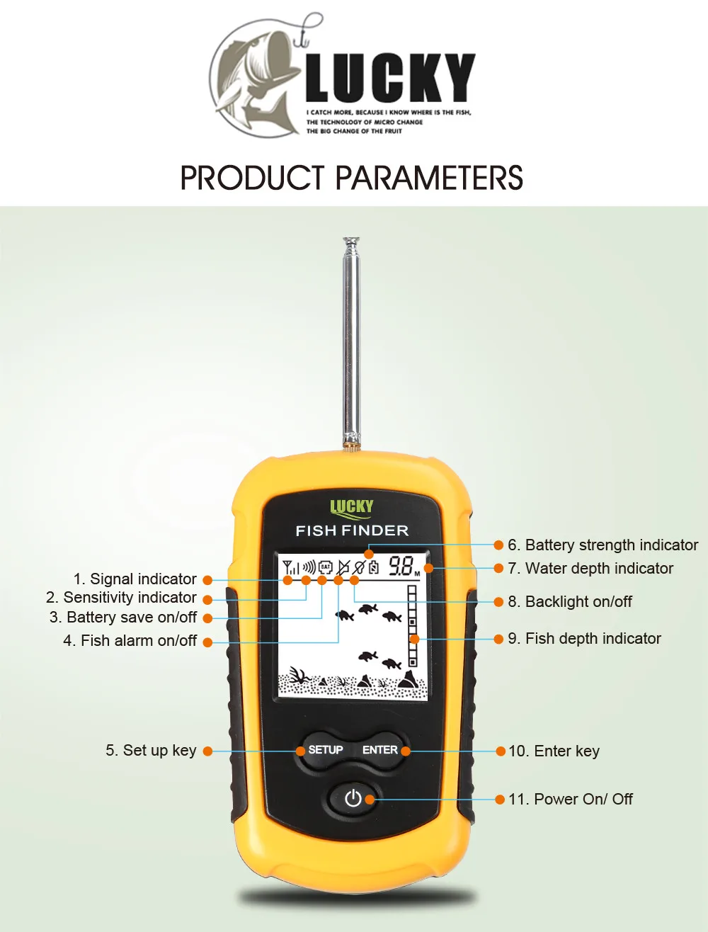1. Сигнальный индикатор 2. Индикатор чувствительности 3. Аккумулятор, экономия, ВКЛ./ВЫКЛ. 4. ВКЛ/ВЫКЛ. 5. Настройка ключа 6. Индикатор батареи 7. Индикатор глубины воды. 8. Подсветка вкл./выкл. 9. Индикатор глубины рыбы 10. Ввод Ключа 11. Включение/выключение питания