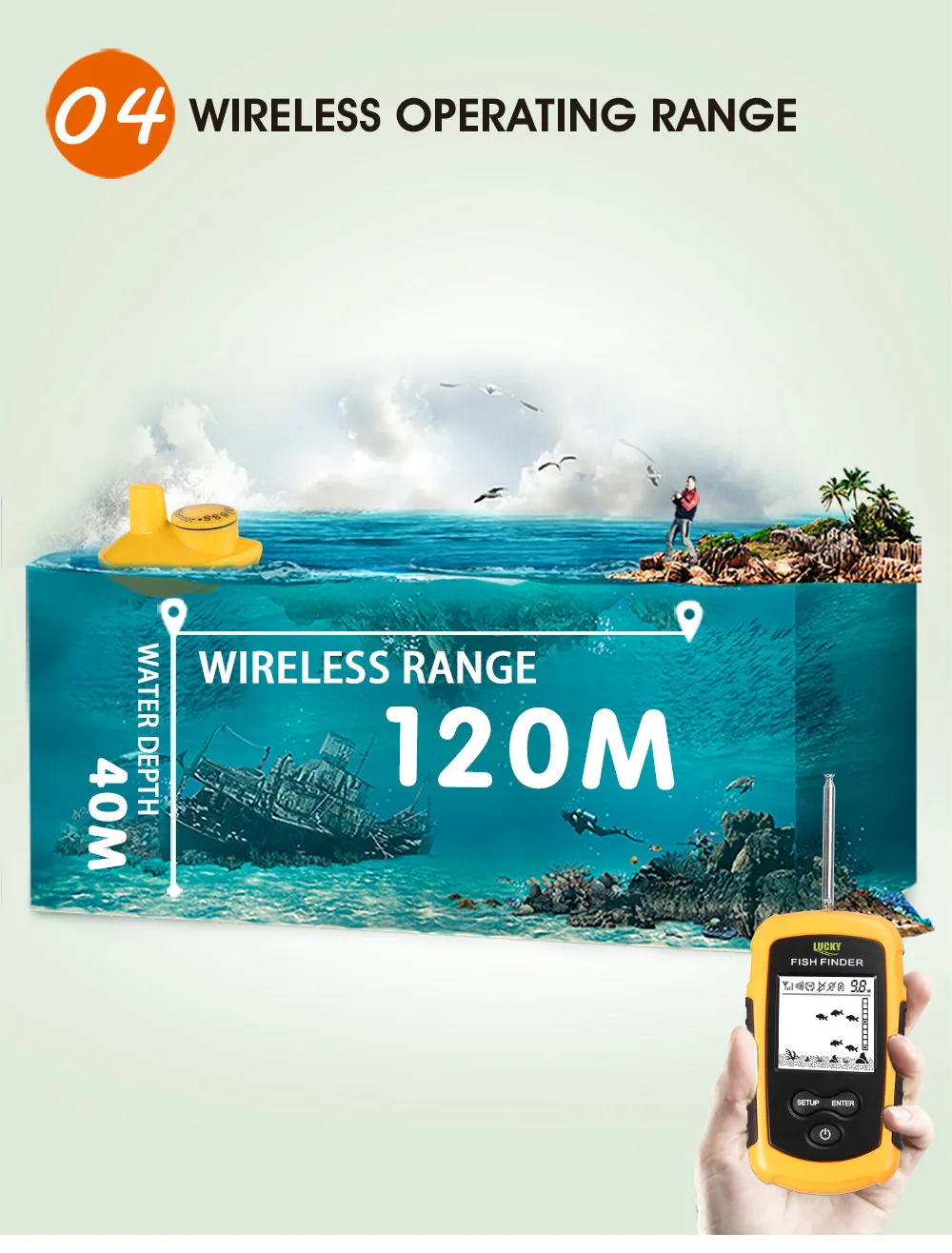 1. Привяжите его к концу рыболовной лески и бросьте в воду 2. Беспроводной сонар-датчик отправляет звуковые волны 3. Возвращаемые эхо, передаваемые в рыболокатор