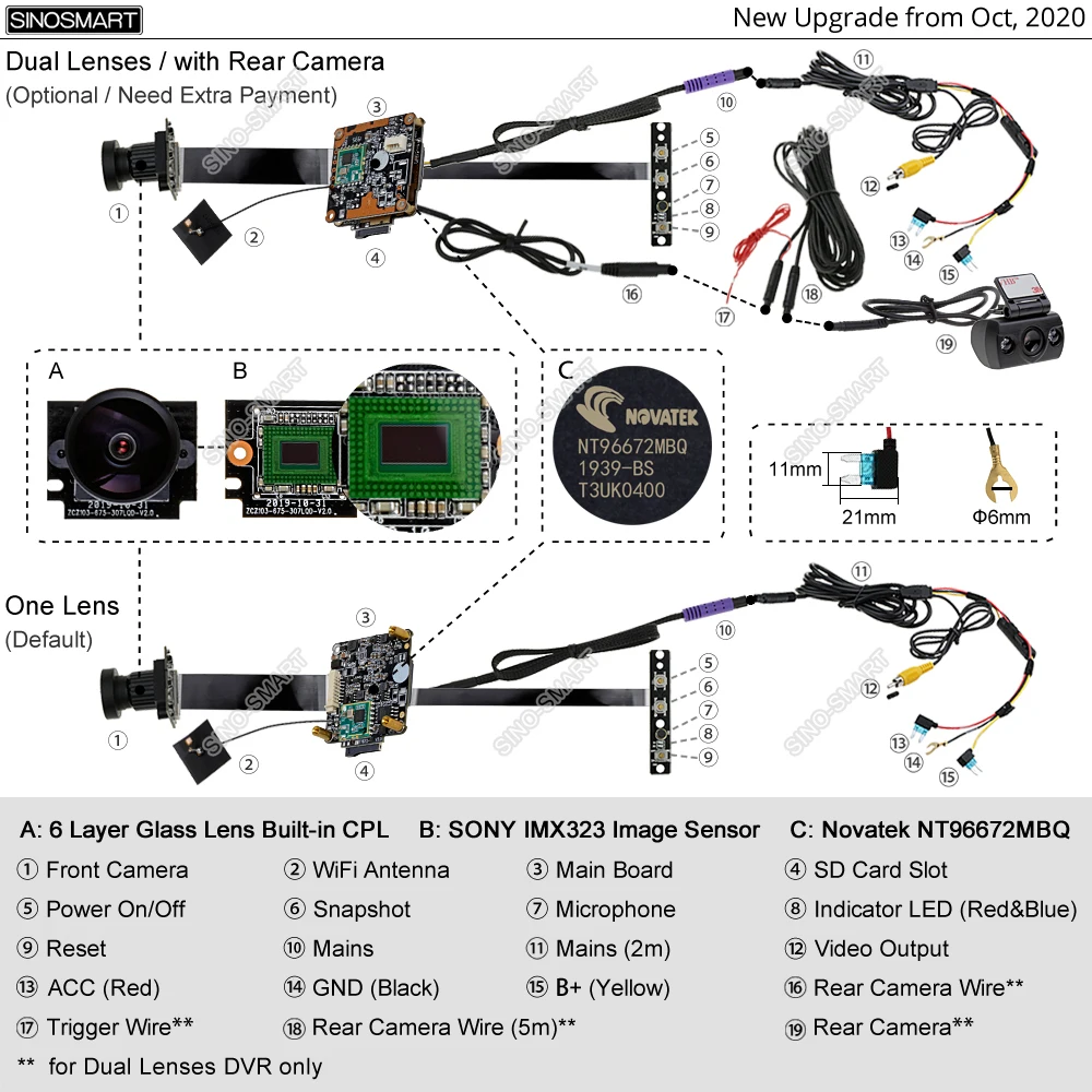 100% автомобиль оригинальный стиль (специальный DVR) F2.0 Большая диафрагма, 170 градусов широкий угол Запись видео в формате HD 1080 P, разрешение 1920*1080 пикселей Sony 12 мегапиксельный датчик, шесть слоев расширенного покрытия объектива Встроенный WiFi, поддержка управления приложением с помощью iPhone, Android Phone, Android 4,4 автомобильная DVD НАВИГАЦИЯ. С g-сенсором, поддержка записи обнаружения движения, непрерывная циклическая запись Включение/выключение на автомобиле, синхронная запись Автоматическая фокусировка, поддержка ночной съемки Делитесь видео на SNS в любое время в любом месте Скачать приложение из Apple Store/Android Market Функция записи: Непрерывная циклическая запись Сенсор: SONY IMX323 / Novatek 96672 (стандартная модель) Угол обзора камеры: 170 градусов широкоугольный Баланс белого: Автоматическая Ночное видение: низкая подсветка WDR (широкий динамический диапазон): Поддержка Формат кодирования видео: H.264 кодирование видео/HD формат MOV Разрешение фронтальной камеры: FHD1080P, (1920*1080)/один объектив. (1440*1080)/двойные линзы. Разрешение камеры заднего вида: 680*480/Full HD (опционально) Кадры в секунду: 30 (один объектив)/25 (двойные линзы) Циклический Видеоклип: Да. Датчик Гравитации: 3-осевой однотонные ускорения столкновения датчик Обнаружение движения: Поддержка Память: TF карта Макс 128 Гб (класс 10) Циклическое Воспроизведение видео: поддержка Язык экранного меню: английский, японский, французский, испанский, немецкий, португальский, итальянский, традиционный китайский, упрощенный китайский Языки приложения: английский Это действительно HD DVR, ему нужна действительно высокая скорость карты памяти 10 класса. Мы настоятельно рекомендуем вам купить у нас карту памяти.