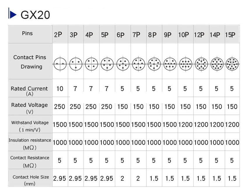 Описание:Диаметр: GX16 GX20 GX12 на выборУсловия окружающей средыТемпература окружающей среды: -50 ~ + 70 CОтносительная влажность: до 98% при + 40 сАтмосферное давление: до 4,4 кПаВибрация: частота вибрации 10 ~ 100 Гц, ускорение 100 м/s2Воздействие: частота от 60 до 80 ударов/мин, разгон 250 м/с2Центробежный: разгон 250 м/s2Основные технические характеристикиНоминальное напряжение: 2 ядра/3 ядра/4 ядра-400 В, 5 контактов/6 контактов/7 контактов/8 контактов-250 В Номинальный ток: 5 АКонтактное сопротивление: (каждая контактная пара) менее 0,005 ОмСопротивление изоляции: в нормальных условиях, не менее 1000мом; После постоянных теплых тестов, не менее 20мом.Испытательное напряжение: (50 Гц, RMS) в нормальных условиях, 2 ядра/3 ядра/4 core-1500V, 5 контактов/7 контактов-1200 в,После проверки постоянного нагрева, 2 pin/ 3 pin /4 pin -1200V, 5pin /7pin- 1000VСила разделения: каждая сила разделения одной ноги составляет 1-3 Н, общая сила разделения составляет полтора от верхнего предела общего количества каждой единицыСила разделения стопыПовышение температуры: при номинальной нагрузке контакт повышения температуры не должен превышать + 50 с температуры окружающей средыСрок службы: после использования вилок 500 раз, розетки и розетки не должны быть повреждены.![]()