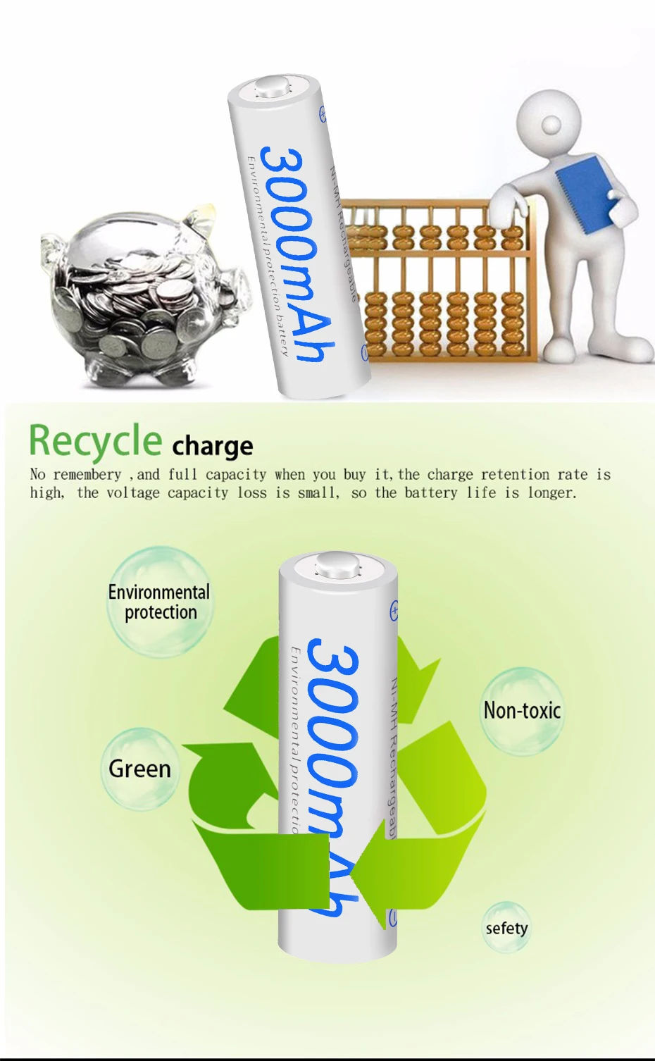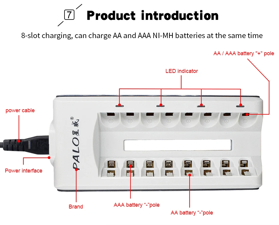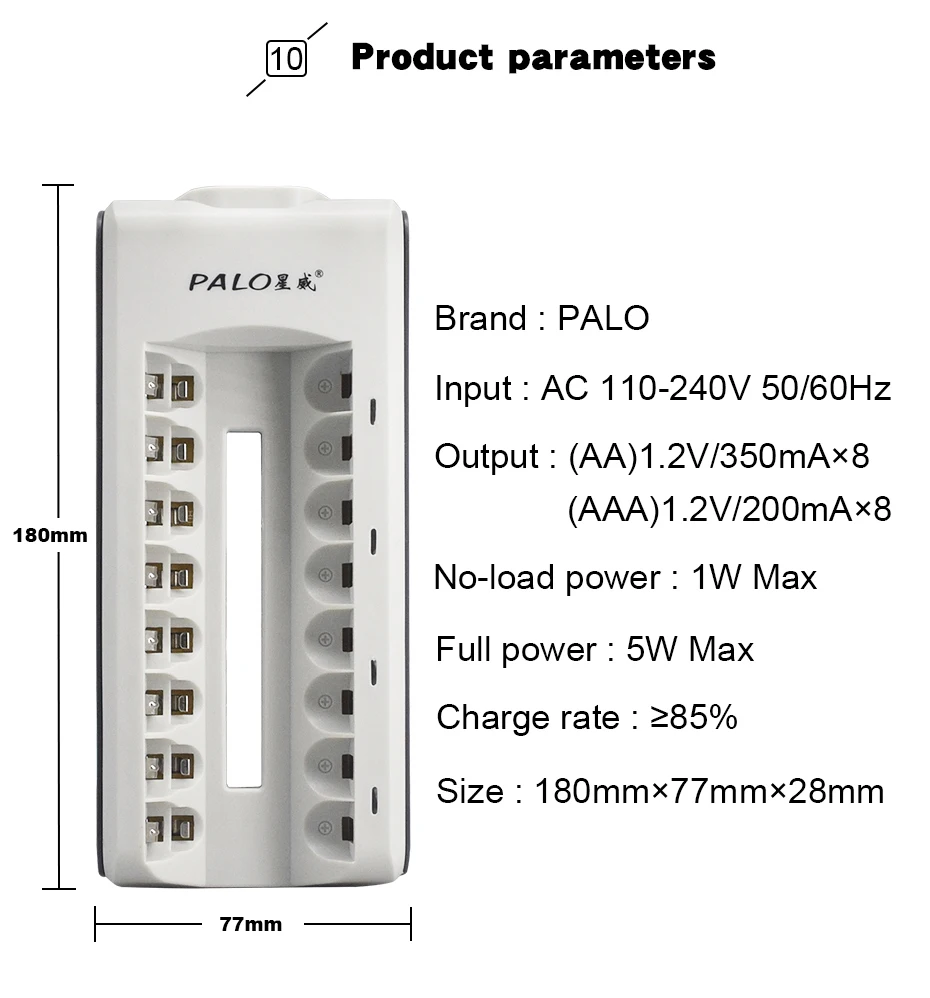 1. Высокая скорость удержания, Заряженная. 2. Высокая способность сохранять напряжение батареи. 3. Низкий уровень потери емкости аккумулятора. 4. Долгий и стабильный Срок службы батареи. 5. Высокая температура разряда. Батарея Особенности Тип: Ni-MH, низкий саморазряд Название бренда: PALO Размеры: 1,2 V AA перезаряжаемый аккумулятор AA Размер: Диаметр * Высота = 14,5 (-0,5) мм * 50,5 (-1,0) мм Номинальное напряжение: 1,2 V Сертификация: CE, ROHS и др. Упаковка: маленькая коробка, пластиковая посылка и т. д. Цикл перезарядки: около 1800 раз Применение 1. Игрушки, цифровые камеры, игровой плеер, MP3/mp4 плеер 2. Фонарик 3. Пульт дистанционного управления 4. Домашний телефонный комплект 5. Бытовые электрические приборы 6. Широко используется для повседневной жизни и т. Д.