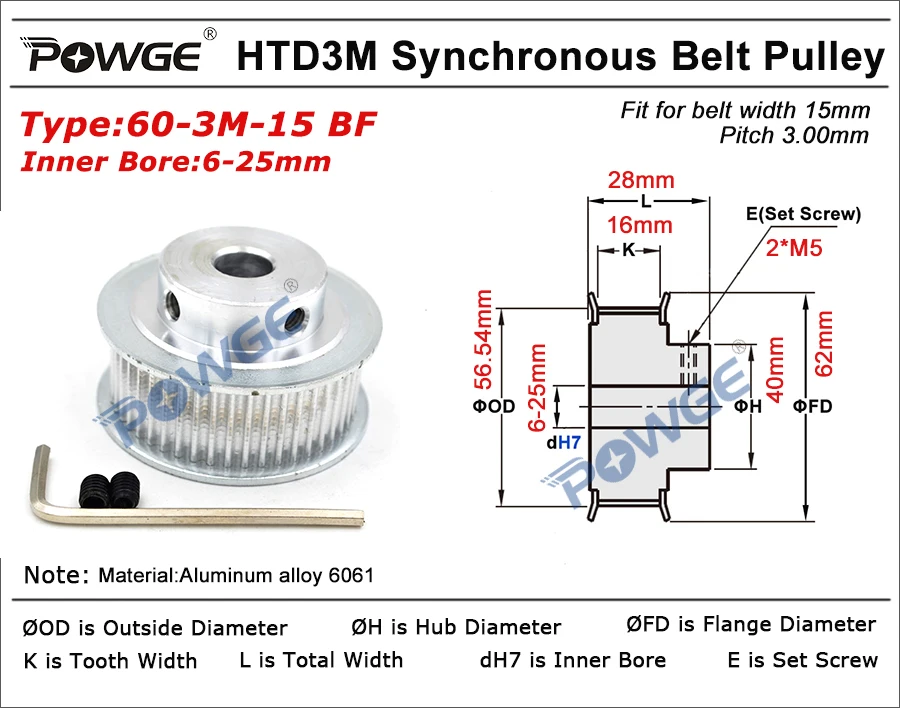 3 шт х60ЗубовHTD Алюминиевый Синхронный шкив 3 м (6 шт., винты M5 1 шт., шестигранный ключ)