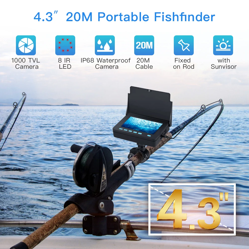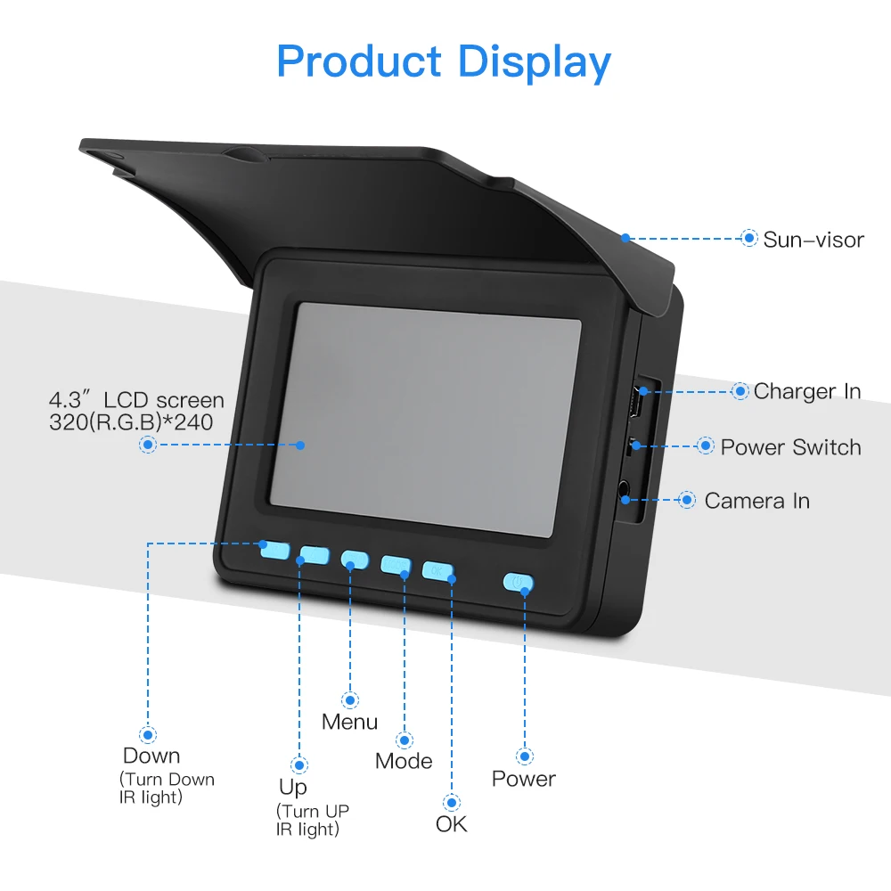 4,3 4,3 "видео подводная рыба Finder】: IP68 водонепроницаемый объектив и 4,3-дюймовый ЖК-дисплей представляют собой визуальную систему-подводную рыбацкую камеру, чтобы вы могли четко видеть приманку для рыбы. Больше удовольствия для рыбалки. Кроме того, он оснащен солнцезащитным козырьком для более удобного использования на открытом воздухе.