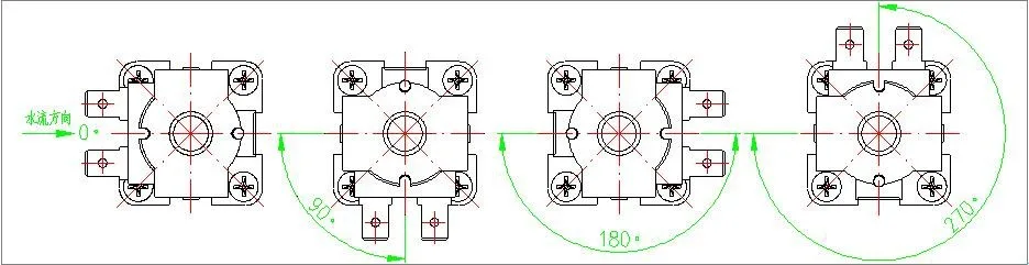 Направление штекерного провода (относится к выходу катушки на центр катушки в качестве начала, ось входа электромагнитного клапана и относительный угол между клеммами против часовой стрелки, может быть использован в соответствии с запросом заказчика): соответственно 0 ° и 90 °, 180 °, 270 °;