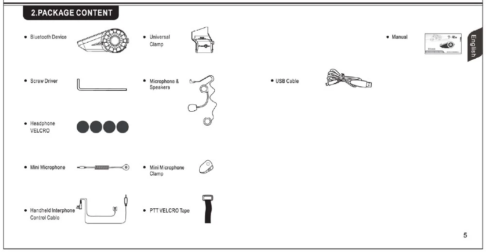 Упаковочные материалы:1 * Bluetooth устройство1 * микрофон и колонки1 * Универсальный зажим1 * отвертка1 * VE-LCROPAD для наушников (4 шт.)1 * мини-микрофон1 * Мини-зажим для микрофона1 * Ручной кабель управления для мобильного телефона1 * PTT VE-LCRO лента1 * USB кабель1 * Руководство пользователя1 * пульт дистанционного управления (подарок)Обратите внимание, пожалуйста, Зарядное устройство/вилка не включены!Список деталей в руководстве не является стандартом доставки, пожалуйста, обратитесь на веб-страницу в качестве стандарта, спасибо за понимание!