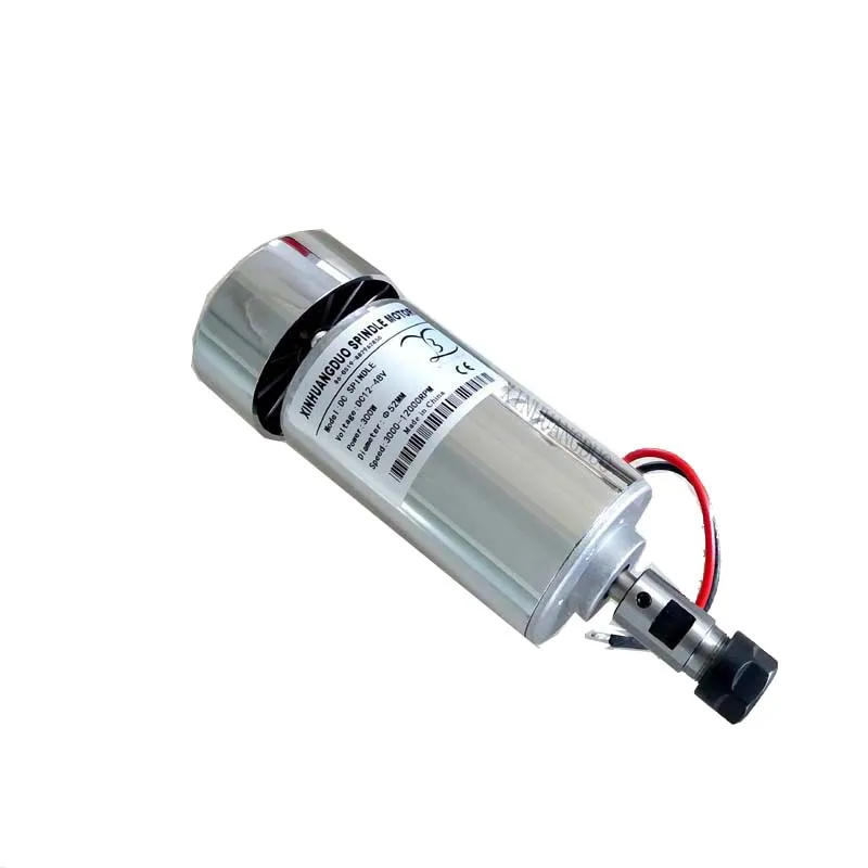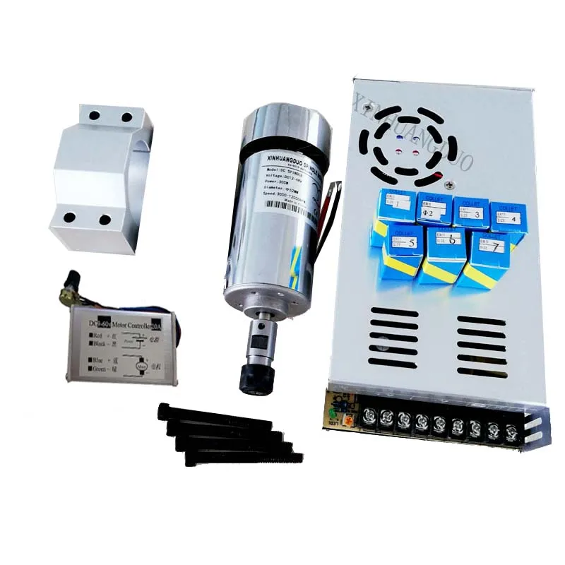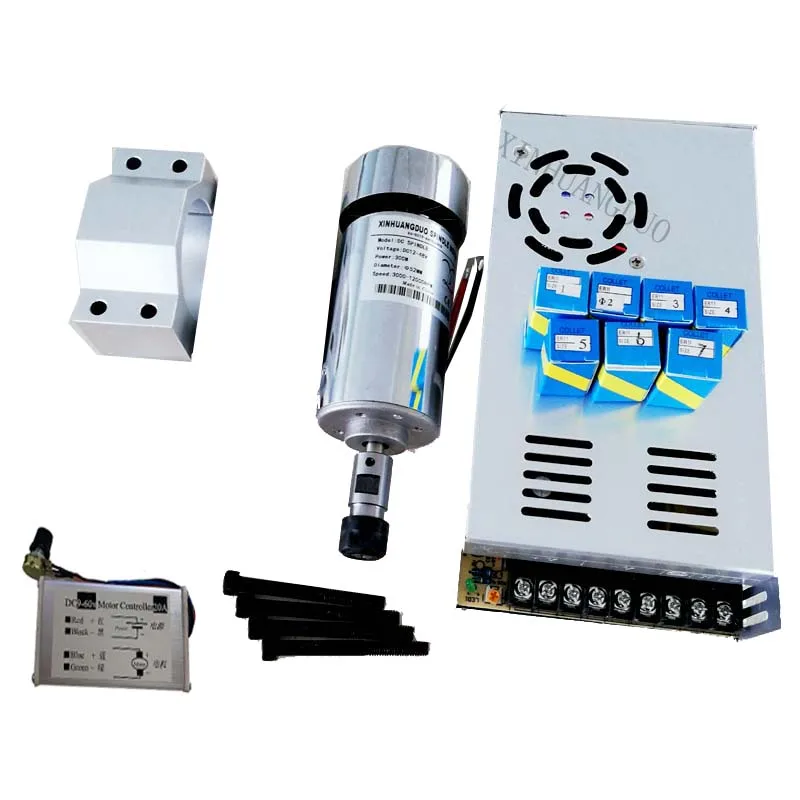 1 шт. 300 Вт мотор шпинделя(Включает в себя 3,175 патронов)1 шт. 48 в 300 Вт источник питания1 шт. кронштейн (включая винты 4 шт.)1 шт. регулятор скорости7 шт ER 11 Цанга (1mm2mm3mm4mm,5mm,6mm.7mm)Рабочее напряжение: 12-48VDCМощность: 300 ВтСкорость: 3000-12000 об/мин (12-3000 об/мин, 24-6000 об/мин, 36-9000 об/мин. 48-12000 об/мин)Крутящий момент: 400mN.mСопротивление изоляции:> 2 megohmsДиэлектрическая прочность: 400 ВДиаметр: 52 ммДлина части патрона: части беседки 35 мм (включая гайки и сэндвич 43 мм)Диаметр патрона детали: 16 ммДлина двигателя: 178 мм (включая захватывающие детали и двигатель)Вылет шпинделя около: 0,02-0,03.Используется для гравировки металла или неметалла и других материалов.Если двигатель должен работать в течение длительного времени, пожалуйста, установите вентилятор с принудительным охлаждением.