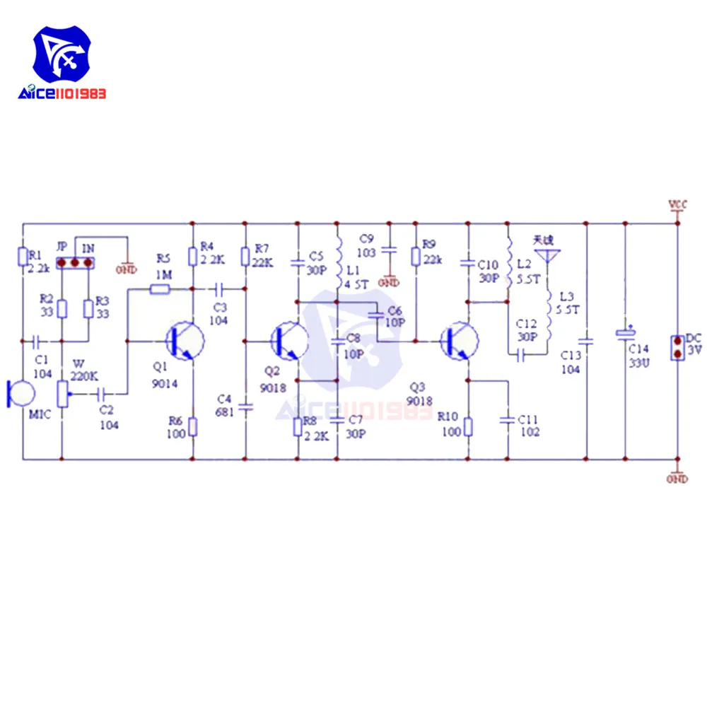 Улучшенный беспроводной микрофон, FM работа, хорошее качество звука, с обычным радио для прослушивания. Микрофон к звуковому сигналу в электрический сигнал, первый уровень усилителя звукового напряжения, чтобы отправить уровень модуляции, так что вы можете подобрать все дальше и слабее звук. После колебания модуляции высокочастотного сигнала, а затем с помощью усилителя мощности настройки, чтобы отправить антенну для запуска, расстояние запуска дальше и уменьшить воздействие антенны на уровень колебания, уменьшить гармоники. Согласно установленной цепи, частота около 83 МГц или около того, просто поверните спираль L на немного, так что частота колебаний работы в 88 МГц-108 МГц может быть, с любым fm-радио, чтобы получить высокочастотный сигнал, и звуковой сигнал восстановлен от высокочастотного сигнала. Также оснащен внешней аудиорозеткой и регулируемым сопротивлением для регулировки затухания входного аудиосигнала.