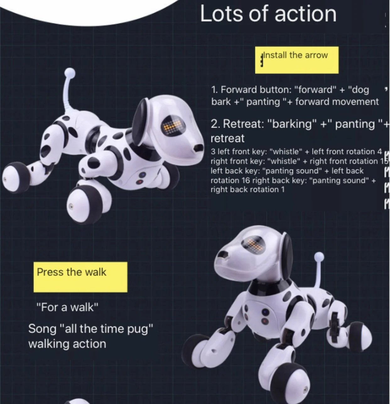 Описание: Интеллектуальный радиоуправляемый робот-собака изготовлена из АБС-материала, экологически чистого и нетоксичного, безвредного для детей. Он имеет два режима управления: пульт дистанционного управления и сенсорное управление, удобно управлять им. Кроме того, он может спеть и танцевать, рассказать истории и так далее, это отличный подарок для ваших детей. Основные Особенности: ● Функция: пение и танцы, рассказы, действия и программирование ● Выполнение действий: приседание, перекатывание, стояние и ходьба, ползание вперед, имитирование мочеиспускания ● Два режима управления: беспроводной пульт дистанционного управления, сенсорное управление ● Экологически чистый АБС-материал, нетоксичный и антикрашеный, без острых краев, безвредный для детей ● Светодиодный светильник для глаз может изменить выражение Особенности: 2,4 GHz Дистанционное Управление Материал: АБС-пластик Режим: режим 2 (левая дроссельная заслонка) Модель Мощность: Встроенный перезаряжаемый аккумулятор Время работы: 30-35 минут Дистанционный пульт Мощность: 2x1,5 V AA батарея (не входит в комплект) Посылка: робот-собака-1 шт., пульт дистанционного управления-1 шт., зарядный usb-кабель-1 шт., руководство пользователя на английском языке-1 шт.