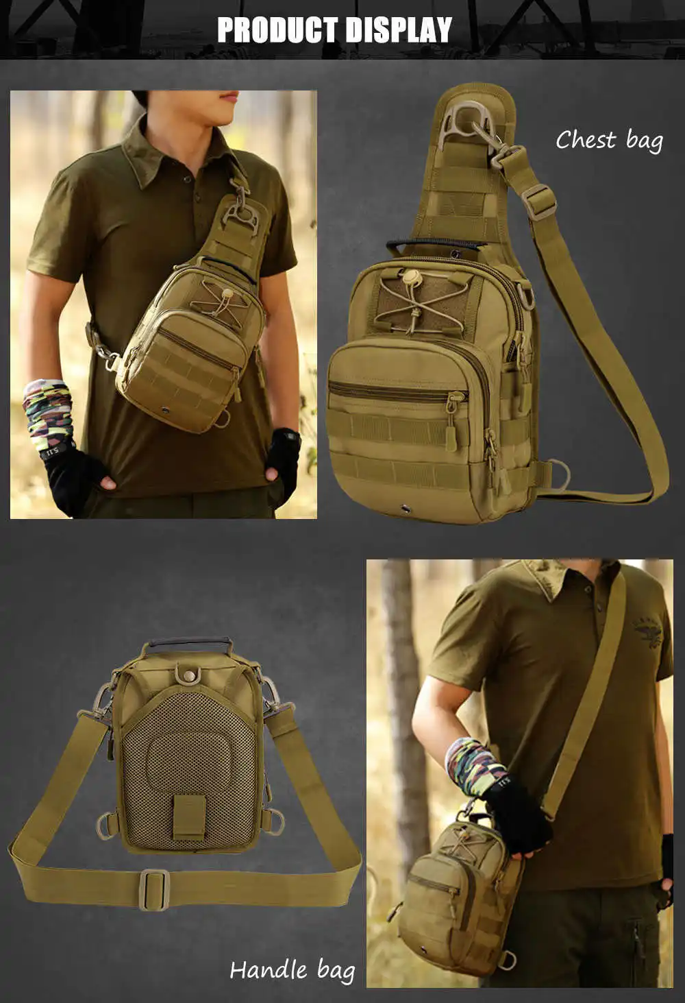 Molle нагрудная сумка через плечо на одно плечо спортивная сумкаМатериал: нейлон Использование: 4 способа,Грудь, рюкзак, плечо, сумочка Цвет: ACU, CB, BLK, CP (Мультикам), DD (Пустынный цифровой), JD (джунгли цифровой), DCU(SD, пустынный камуфляж униформа) | |