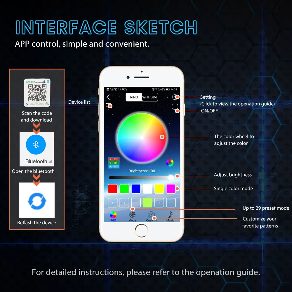 Это приложение RGB Bluetooth Angels eyes подходит для IOS и Android системы, управление простым и удобным.