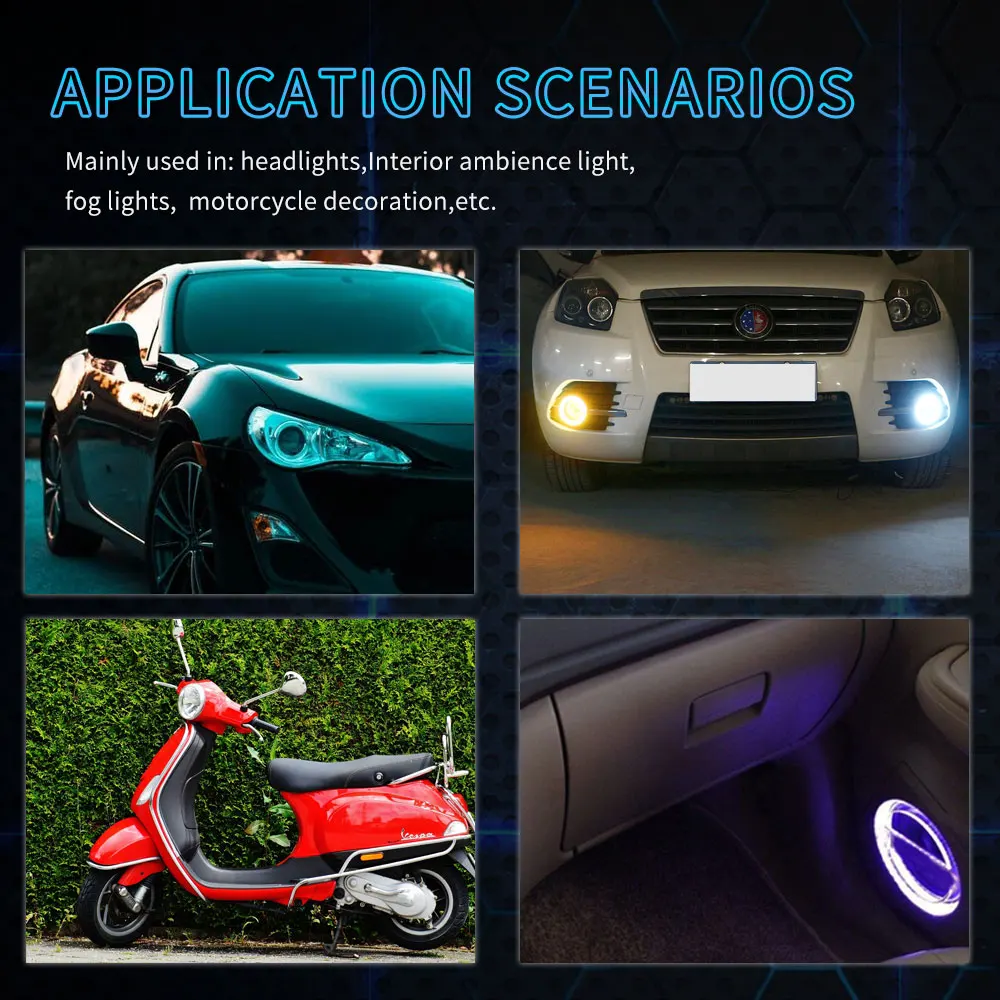 Широкое применение: его можно использовать для дневных ходовых огней, противотуманных фар, светодиодный фар, ангельских глаз, атмосферных огней, декоративных огней и т. д. подходит для автомобилей, скутеров, мотоциклов, снегоходов и т. д.