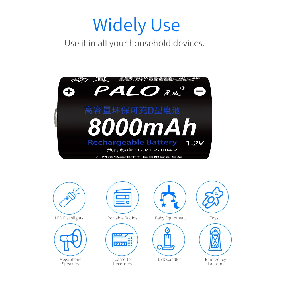 1. Игрушки2, фонарик3, пульт дистанционного управления4. Бытовые электроприборы5, широко используется для нашей повседневной жизни и т. д.Особенности: аккумуляторТип: Ni-MH низкий саморазрядНазвание бренда: PALOРазмер: D размерРазмеры: диаметр * высота = 33,0 (-1,0) мм * 61,5 (-1,0) ммНоминальное напряжение: 1,2 вИндивидуальная Емкость: 4000-9000 маСертификация: CE, ROHSУпаковка: блистерная карта, маленькая коробка, посылка и т. Д.Смотрите так же другие товары: