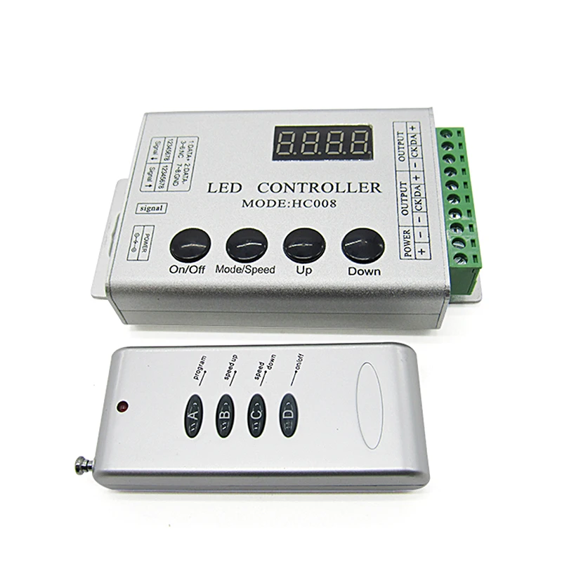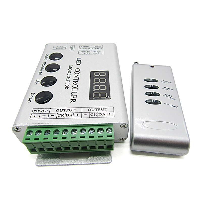 HC008 беспроводной Symphony светодиодный контроллер HC008 подходит дляUCS1903(WS2811,LPD6803, TM1804 и т. Д.) Выходные приложения, которые управляют непосредственно светодиодный. Он широко используется в рекламе, сценических наборах, украшениях для дома и т. д. он имеет много преимуществ, таких как низкая цена, простое подключение и простота в использовании. Имеет функцию памяти. Между тем, вы можете настроить яркость, выбор статического цвета и различные динамические изменения световых эффектов через беспроводной пульт дистанционного управления. Он также может использоваться в качестве синхронного контроллера. Это означает, что вы можете синхронизировать количество декодеров и светодиодный индикатор.