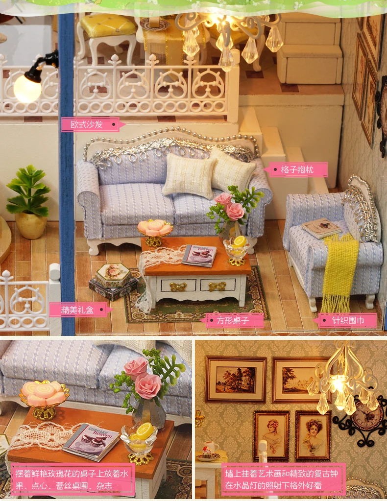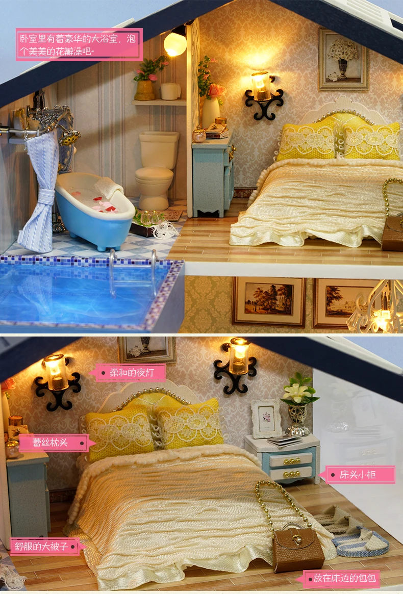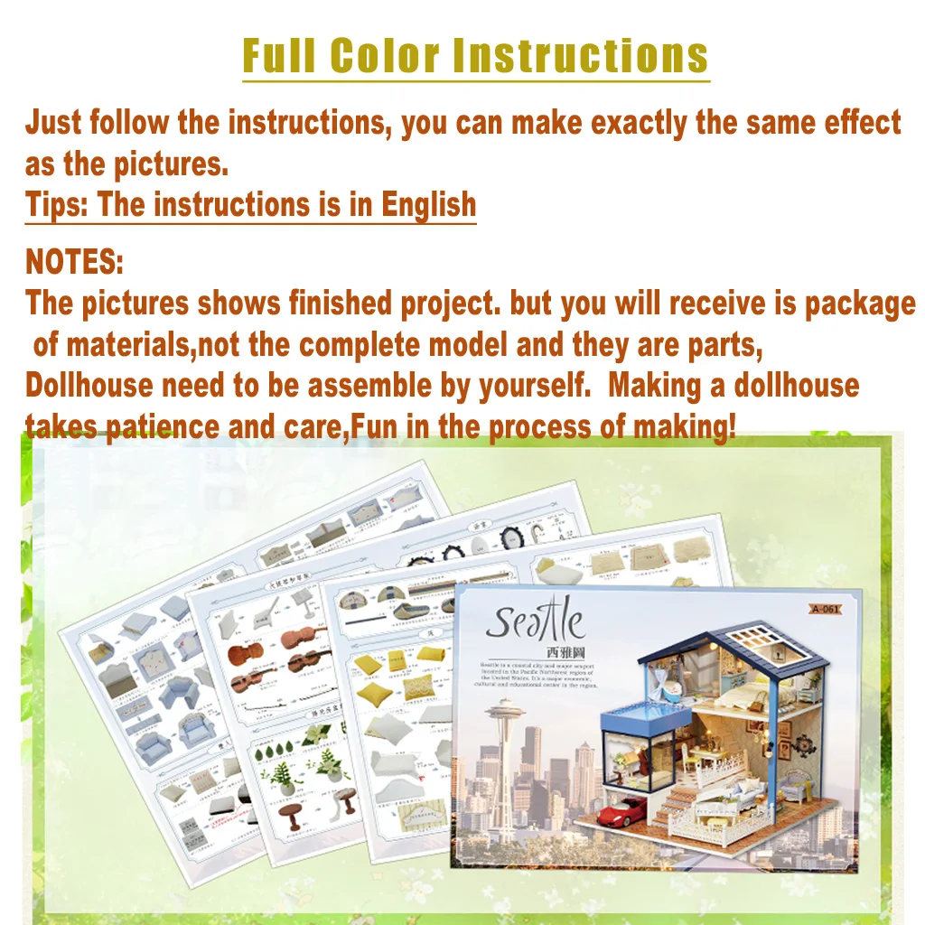 [Размер готовой продукции]: (Д * Ш * В) 29*24*21,5 см; [Аксессуары продукта]: материалы DIY + светодиодная лампа + музыкальный механизм + пылезащитный чехол [Свет]: светодиод с переключателем корпуса аккумулятора; (без батарей) [Материал]: дерево, ткань, бумага, смола, АБС и другие; [Тип размера]: большой дом; [Трудность сборки]:★★★★; [Примечание]: На фотографиях изображен готовый проект. Но вы получите пакет материалов, а не полную модель и они являются частями, кукольный домик должен быть собран самостоятельно. Изготовление кукольного домика требует терпения и заботы, веселья в процессе изготовления!