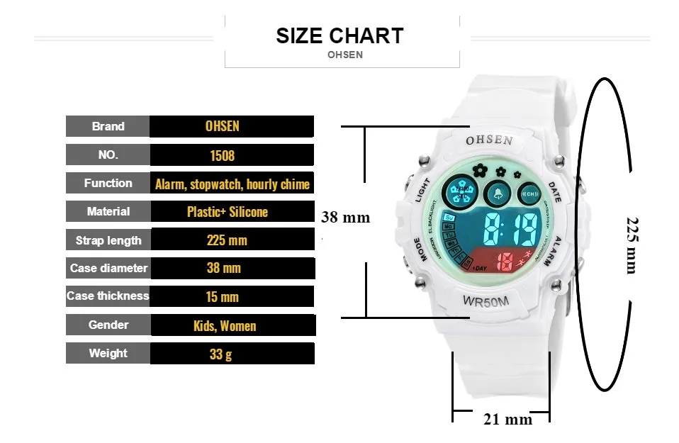 Чехол Диаметр: 38 мм/1,49 дюймов Чехол Толщина: 15 мм/0,59 дюймов Цвет ремешка: как на картинке Длина ремешка: 225 мм/8,85 дюйма (ремешок можно регулировать) Ширина ремешка: 17 мм/0,67 дюйма