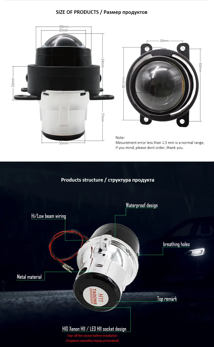 1. Объектив проектора Taochis M6 2,5 "противотуманная фара 2. С дальним и ближним светом. 3. Простая установка и легко проволока.