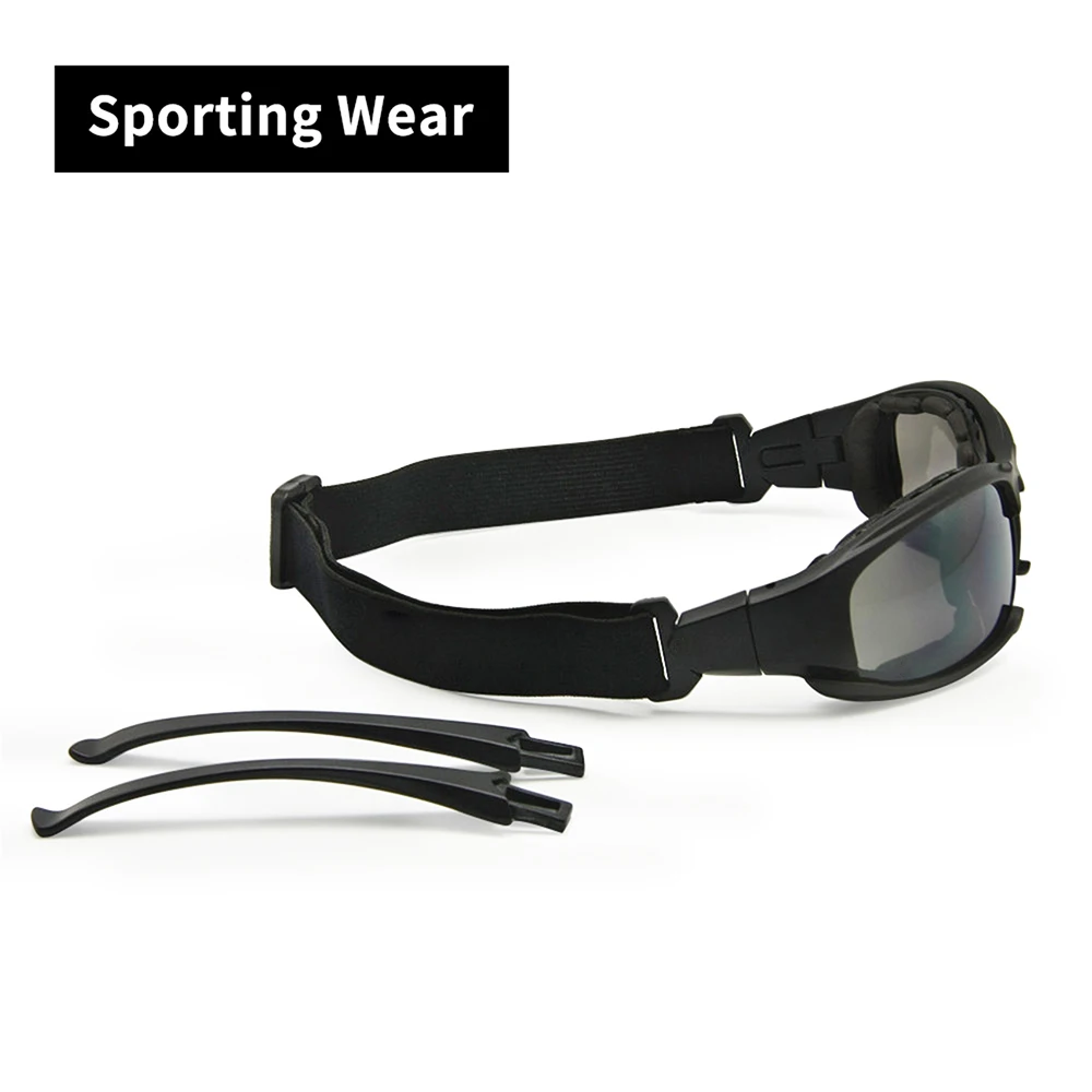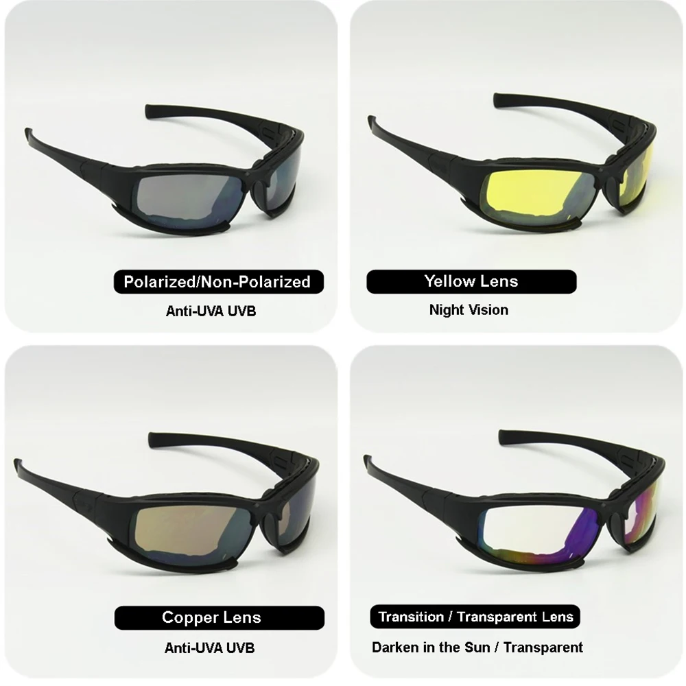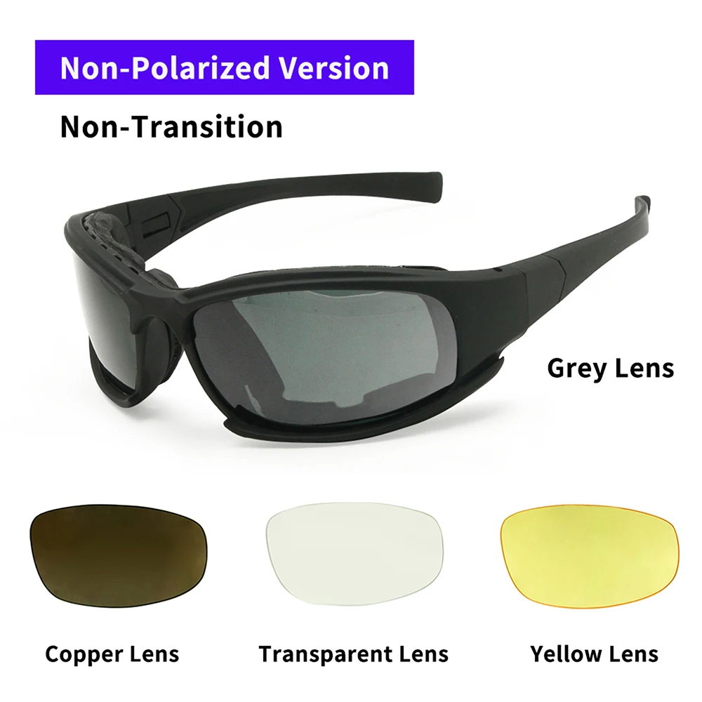 2. Поляризованная версия: 1 серые линзы (поляризованные), 1 прозрачные линзы (анти-УФ), 1 разноцветные линзы (Анти-УФ), 1 желтый объектив (ночное видение);
