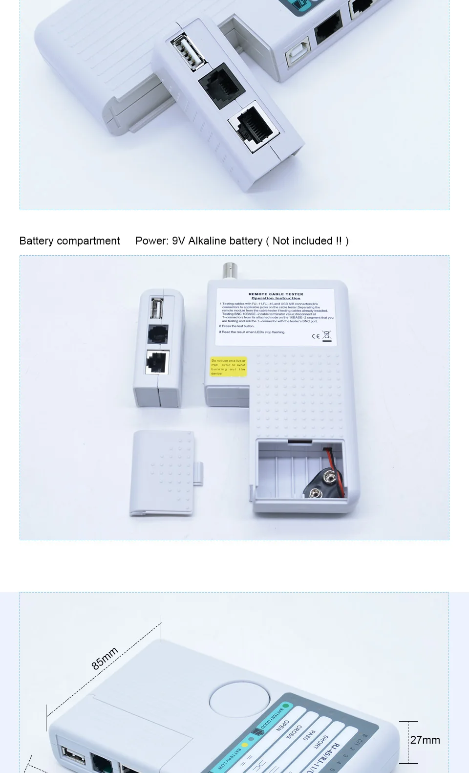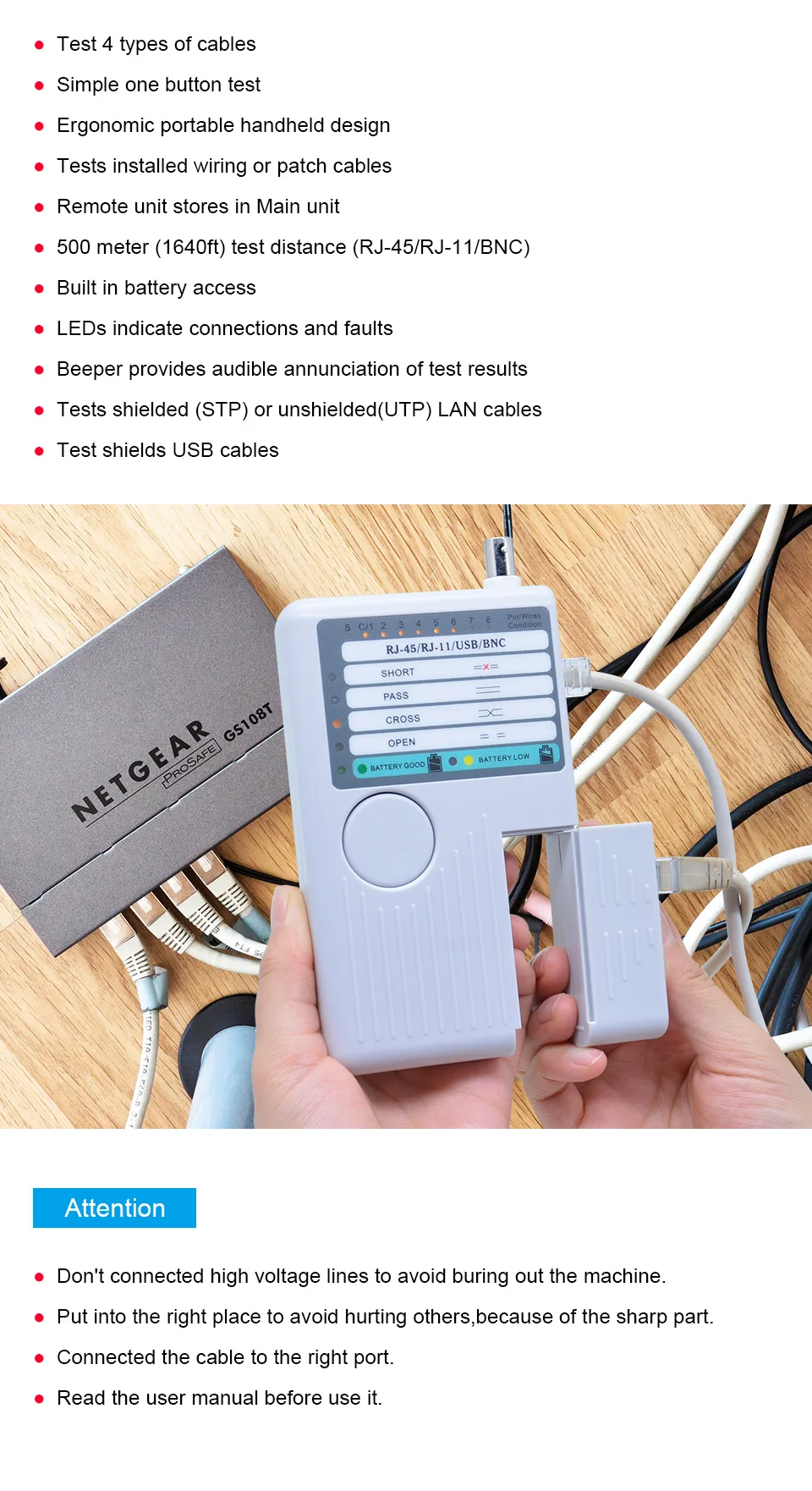 1. Тесты 4 типа кабелей: RJ11/ RJ45/ USB/ BNC.