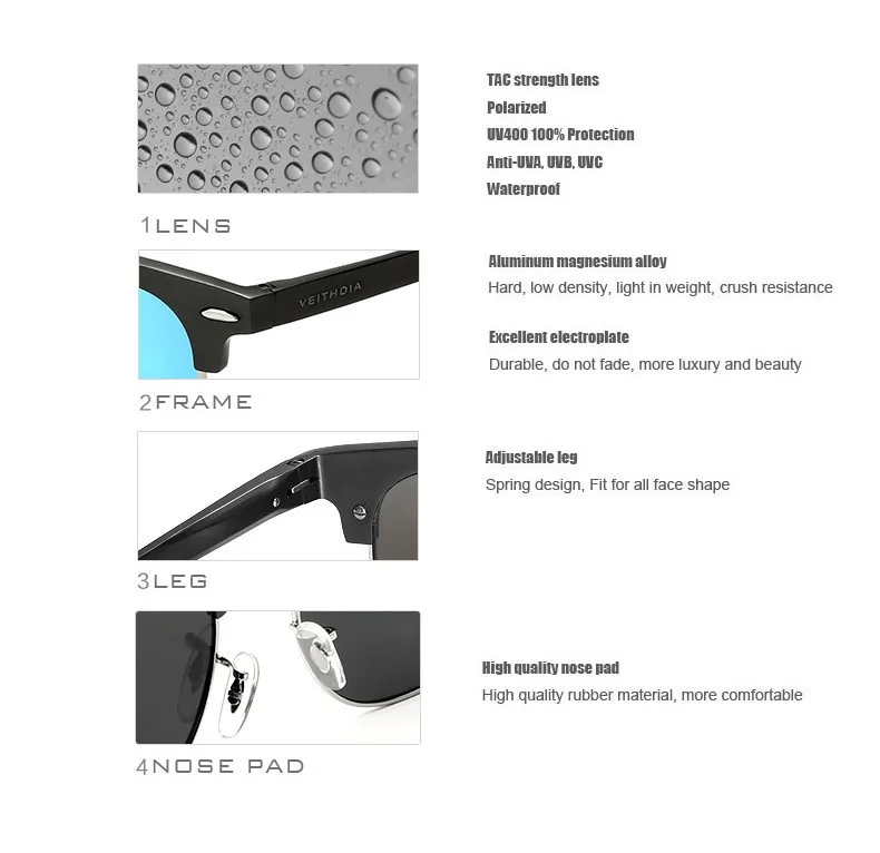 Бренд: VEITHDIA Качество: AAA + + +. Материал линз: поляризационные линзы Polaroid. Материал зеркальных ножек: Алюминиевый Магниевый сплав. Видимая перспектива: 99 (%). Уровень защиты от ультрафиолета: 100% защита от ультрафиолета UV400. Прочность: сильная. Характеристики: мужские, Gafas de sol, oculos masculino. Поляризация: поляризованные очки. Подходящие места: вождение, рыбалка, повседневный стиль. Вес: около 23 г. Толщина линз: 1,1 мм. Ширина линз: приблизительно 50 мм. Ширина моста: около 16 мм. Высота оправы: около 48 мм. Ширина оправы: около 145 мм. Длина ножек: около 140 мм. Стиль: солнцезащитные очки. Солнцезащитные очки для вождения. Вы едете за рулем, занимаетесь спортом на открытом воздухе, рыбалкой, путешествуете, украшаете идеального компаньона! Это также станет отличным подарком для ваших друзей и семьи! Цвет: как на изображении. Из-за низкого уровня фотографии реальный товар намного лучше, чем на картинке. Посылка включает в себя: Поляризованные солнцезащитные очки (без чехол)-1 шт. 1 x одежда для очков 1 x поляризованная Тестовая карта
