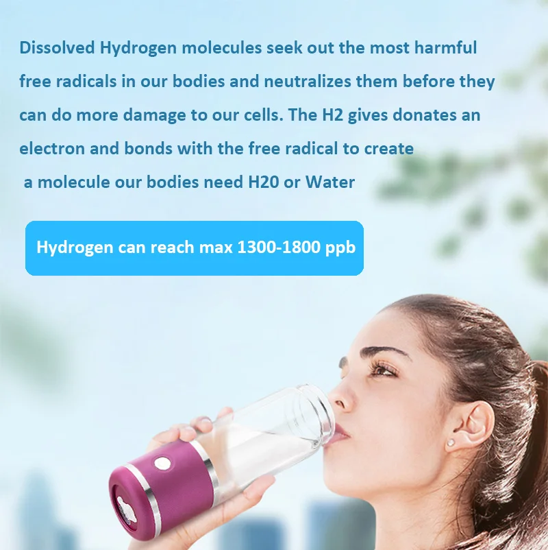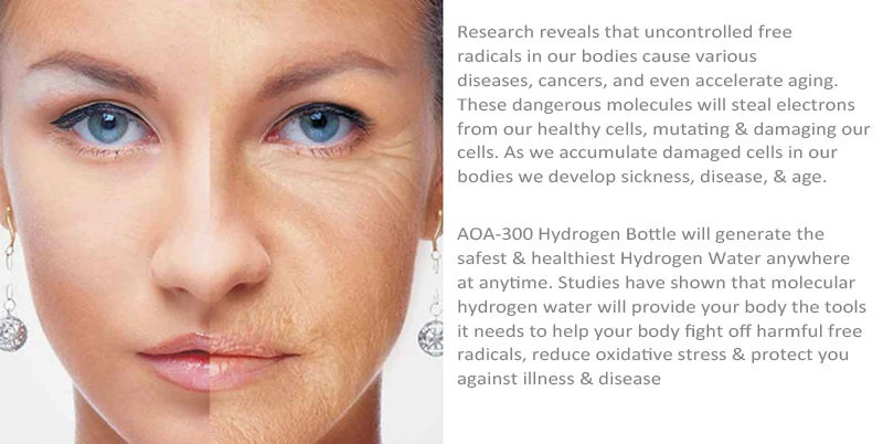 What is Hydrogen Water ? Hydrogen water or hydrogen rich water (water enriched with hydrogen gas) is drinking water saturated with molecular hydrogen (H2). Hydrogen water is filled with antioxidants, anti-inflammatory and anti-allergic properties. In addition, it also stimulates the metabolism and hydrates the organs which lead to great health benefits for humans and animals. It is a natural remedy for health, youth and beauty. It is perfect for every person of any age category, including babies and pregnant women. Free radicals damage our cells and cause healthy problem. Dissolved Hydrogen molecules seek out the most harmful free radicals in our bodies and neutralizes them before they can do more damage to our cells. The H2 gives donates an electron and bonds with the free radical to create a molecule our bodies need H20 or Water. AOA-300 has following product features: 1: Aesthetic design , beautiful 2. Japanese PEM ion membrane 3. Imported Titanium with 7-layer platinum coating . 4. Remove Ozone & Chlorine & Oxygen & Hydrogen peroxide 5. Hydrogen max up to 1300-1800 ppb and ORP -200mV ~ -500mV 6. Use exclusive technology of hydrogen dissolve technology , hold high hydrogen in the water for more than 1 hours after hydrogen production. 7. No limit of source water , even distilled water and purified water can be used. 8. Dual-use design , compatible with plastic bottles with bottleneck diameter 26mm