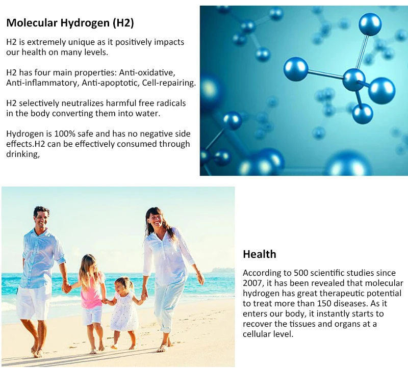 According to 500 scientific studies since 2007, it has been revealed that molecular hydrogen has great therapeutic potential to treat more than 150 diseases. As it enters our body, it instantly starts to recover the tissues and organs at a cellular level. Key Health Benefits: • Remove harmful free radicals from your body • Improve cellular health and protection • Enhance better nutrient absorption in the body • Better hydration for your body • Increase blood circulation • Helps to lower saturated fat levels • Reduce aging to give healthy looking skin • Improves muscle-tissue functions & joints mobility • Reduce constipation problems • Aids in lowering cholesterol levels • Detoxifies your body • Faster recovery from physical workout • Improves quality of life for cancer patients undergoing medical treatment.