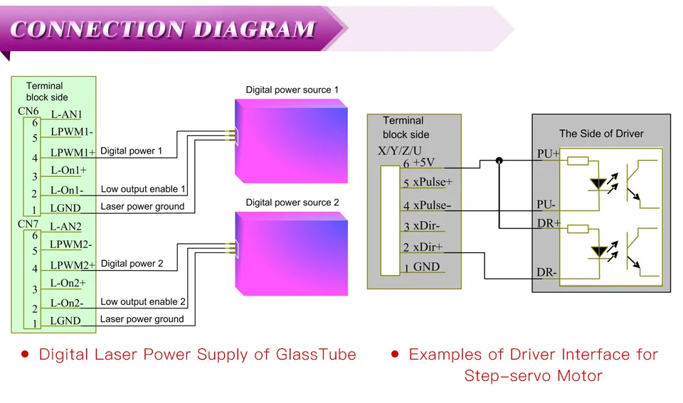 Двусторонний Независимый Цифровой/аналоговый интерфейс, программное обеспечение может быть отрегулировано соответственно, удобно для двойного управления лазерными головками; Специальный интерфейс лазерного управления RF