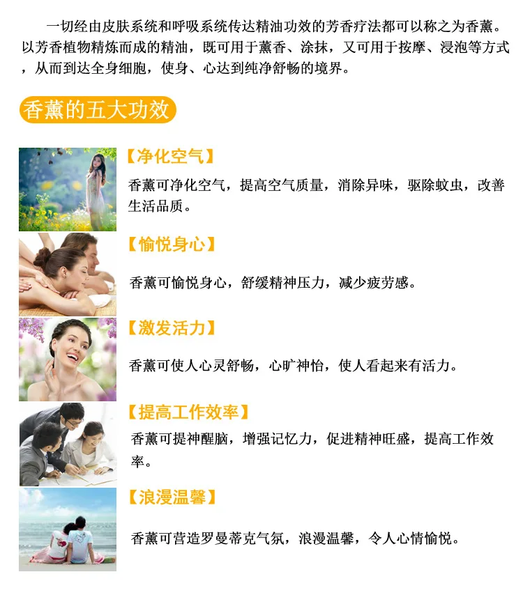 Люди через ингаляцию, массаж, горячий компресс, замачивание, пропаривание, ароматическое масло (также известное как растительные масла) быстро попадают в кровь и лимфы в организме человека, может ускорить тело, новый превосходит старый. способствует регенерации живых клеток, повышает иммунитет, И регулируют нервную систему человека, систему кровообращения, эндокринную систему, мышечную ткань, пищеварительную систему, выделительную систему и т. д. Обычно используется ароматерапевтическое масло для ванны и массажа, с мягкой музыкой, ароматизирующим нос свежим и сладким ароматом, и костным мозгом, тонкий аромат плавает, поэтому у вас есть очаровательный и романтичный характер.
