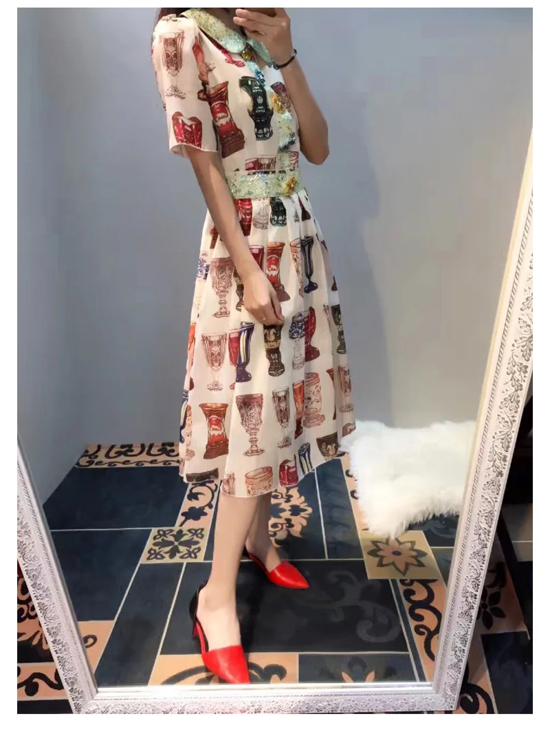 2017 Весна Лето Подиум платье высокого качества с коротким рукавом Питер Пэн воротник Хрустальные Кнопки чашки Печатных Середины икры Платья