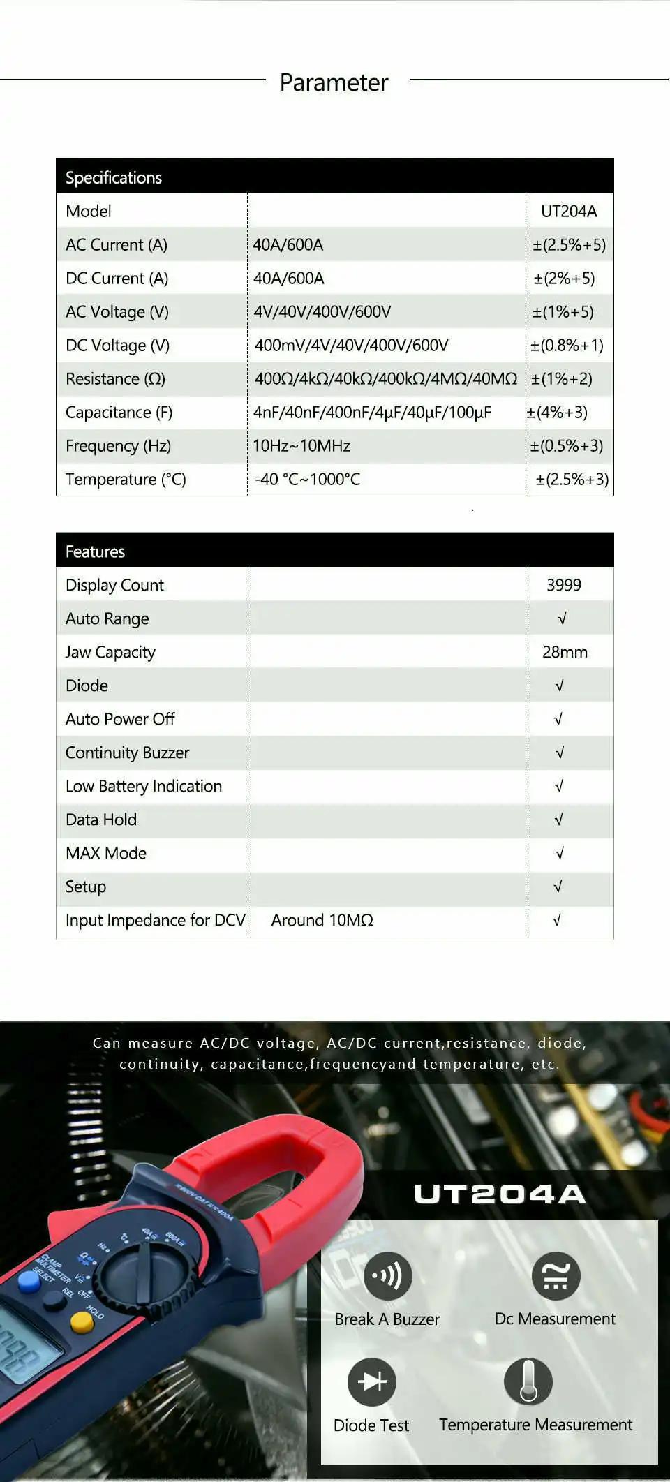 UT204A от UNI-T представляет собой Автоматический диапазон 600A цифровой клещи с функцией измерения температуры и емкости.