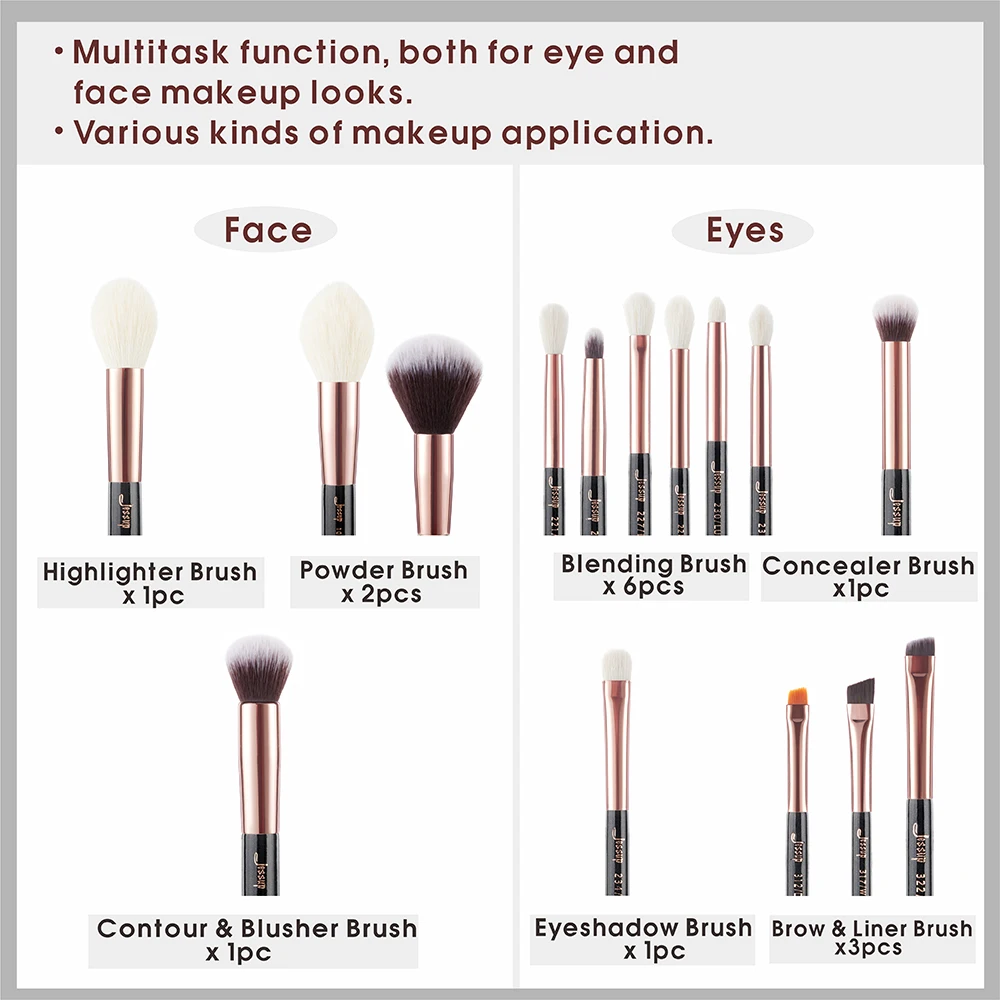 Набор из 15 кистей Jessup T162 розово-золотого/черного цвета 101 Кисть «Face Definer» Длина кисти: около 17,5 см Длина щетины: 4,7 см Тип рукоятки: дерево Тип волоса: синтетический волос Контуринг и нанесение пудры 105 Кисть для хайлайтера «Highlight» Длина кисти: около 16,7 см Длина щетины: около 3,2 см Тип рукоятки: дерево Тип волоса: синтетический волос Нанесение хайлайтера 106 Кисть для пудры «Powder» Длина кисти: около 15,8 см Длина щетины: 4,8 см Тип рукоятки: дерево Тип волоса: синтетический волос Нанесение рассыпчатой и компактной пудры 110 Кисть для контуринга «Face Shape» Длина кисти: около 15,4 см Длина щетины: около 2,2 см Тип рукоятки: дерево Тип волоса: синтетический волос Контуринг лица кремом и пудрой 142 Кисть «Concealer Buffer» Длина кисти: около 15,6 см Длина щетины: около 1,6 см Тип рукоятки: дерево Тип волоса: синтетический волос Нанесение тонального крема и создание переходов 221 Кисть «Soft Crease» Длина кисти: около 16,6 см Длина щетины: около 1,8 см Тип рукоятки: дерево Тип волоса: синтетический волос Смешивание теней до совершенства 223 Кисть «Petit Eye Blender» Длина кисти: около 15,4 см Длина щетины: около 1,3 см Тип рукоятки: дерево Тип волоса: синтетический волос Акцентирование штрихов 227 Кисть «Soft Definer» Длина кисти: около 16,2 см Длина щетины: около 1,2 см Тип рукоятки: дерево Тип волоса: синтетический волос Мягкое создание переходов и сглаживание теней для век 228 Кисть «Crease» Длина кисти: около 16,4 см Длина щетины: около 2,1 см Тип рукоятки: дерево Тип волоса: синтетический волос Создание переходов и оттенение теней в складке века 230 Кисть-карандаш «Pencil» Длина кисти: около 16,3 см Длина щетины: около 1,2 см Тип рукоятки: дерево Тип волоса: синтетический волос Точное оттенение и сглаживание краев 231 Кисть «Petit Crease» Длина кисти: около 15,7 см Длина щетины: около 1,6 см Тип рукоятки: дерево Тип волоса: синтетический волос Акцентирование и создание переходов в складке века 234 Кисть «Luxe Smoky Shader» Длина кисти: около 15,6 см Длина щетины: около 1,7 см Тип рукоятки: дерево Тип волоса: синтетический волос Оттенение и создание переходов с эффектом дымки 312 Кисть «Detail Liner» Длина кисти: около 15,2 см Длина щетины: около 0,5 см Тип рукоятки: дерево Тип волоса: синтетический волос Тонкие и точные штрихи подводки для глаз 317 Кисть для складки века «Wing Liner»: Длина кисти: около 15,7 см Длина щетины: около 0,8 см Тип рукоятки: дерево Тип волоса: синтетический волос Точные штрихи подводки для глаз и совершенные стрелки 322 Кисть для бровей «Brow Line» Длина кисти: около 17,0 см Длина щетины: около 0,6 см Тип рукоятки: дерево Тип волоса: синтетический волос Кисть для пудры и крема для бровей
