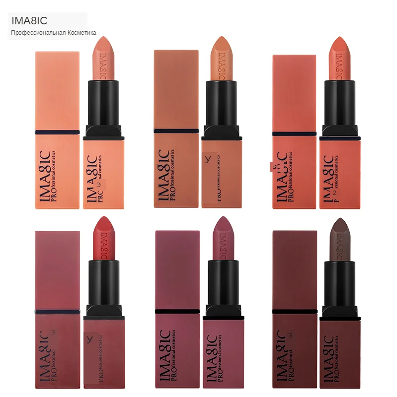 Бренд: IMAGIC Название продукта: матовая помада Сведения: Цвет: A01, A02, A03, A04, A05, A06 Вес нетто: 3,5 г Упаковка: 1 шт. помада Эффекты: богатые витаминами Е и пчелиным воском увлажняющие ингредиенты восстанавливают линии губ и защищают от любых загрязнений внешнего мира. Текстура нежная, гладкая и пигментированная — сексуальные губы это заслужили. Применение 1. Осторожно пошевелите губами несколько раз после использования. 2. При нанесении небольшого количества получается натуральный розовый цвет, при многократном применении достигается великолепный и очаровательный эффект. Внимание: 1. Не использовать для других целей, кроме макияжа. 2. Избегать попадания прямого солнечного света или воздействия слишком высоких или слишком низких температур. 3. Хранить в недоступном для детей месте.