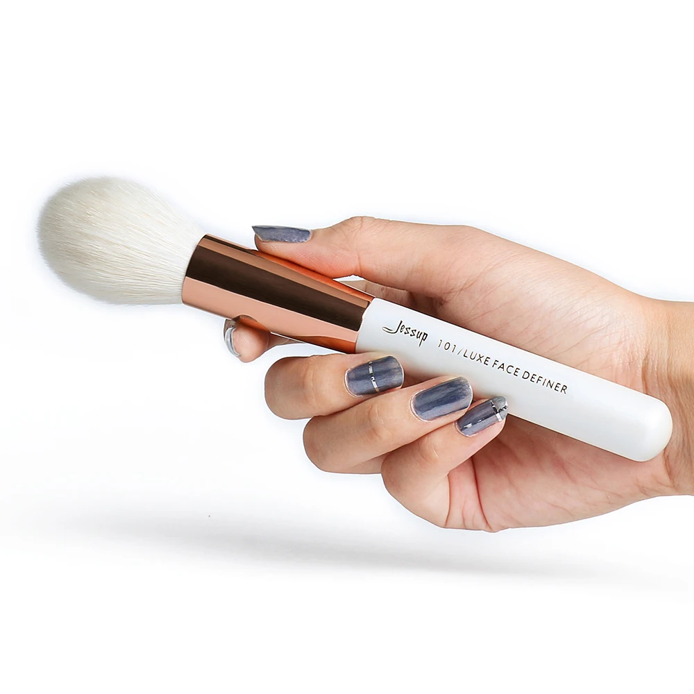 1.Ворс: Патентные, Cмешанные Натуральные и Синтетические Волосы Традиционная Ручная Работа Эластичный, Мягкий и Шелковистый, Плотный Сильная Способность Схватывать Сухие Текстуры 2.Ручка: Древесина Березы с 7-кратным Покрытием Роскошный Жемчужно-Белый Подходящий Вес Эргономичная, Удобная в Использовании 3.Муфта: Тонкая Металлическая Муфта Цвета Розового Золота Чрезвычайно прочный