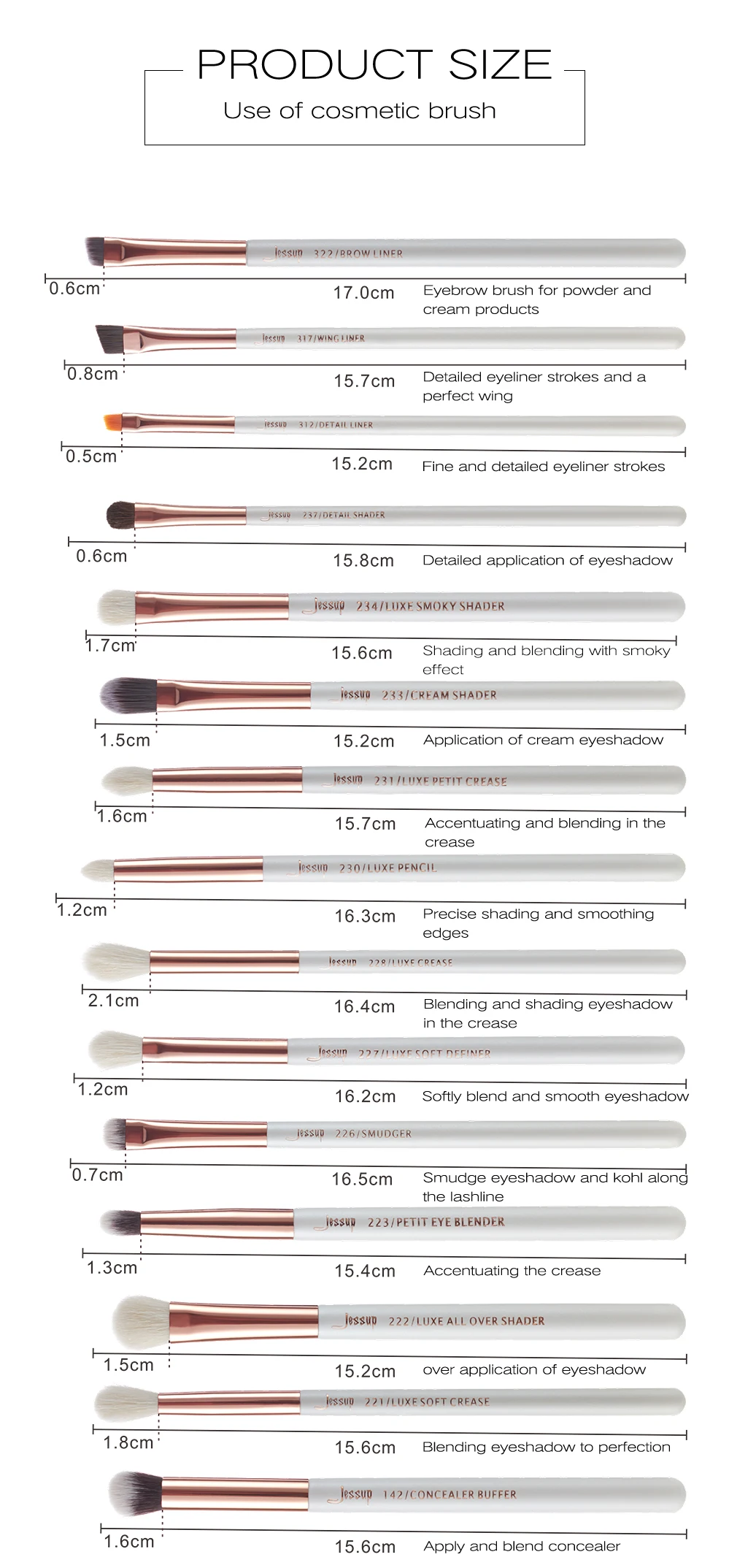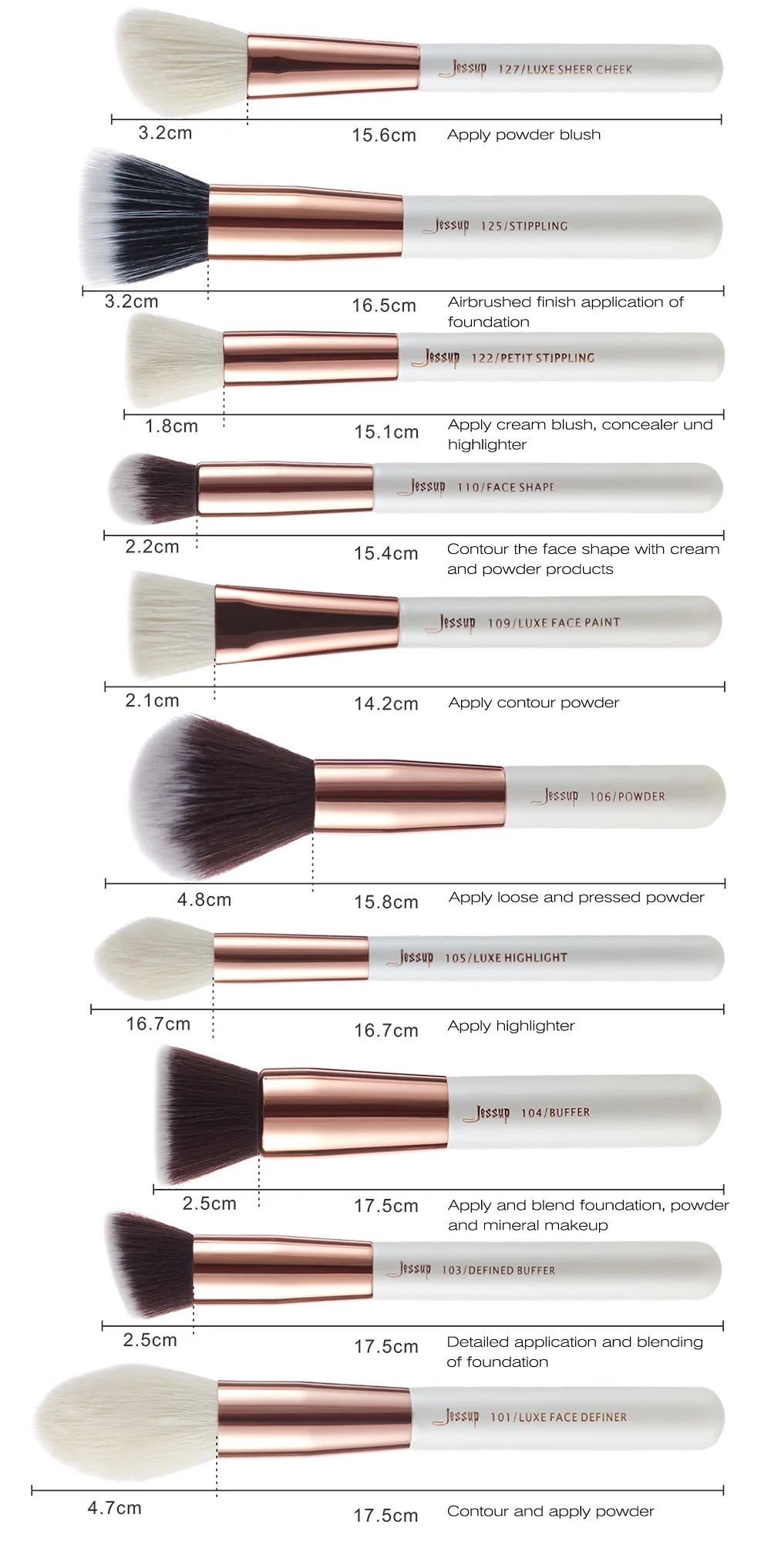 101 Контуры лица: Длина кисти около: 17,5 см. Длина кончика около: 4,7 см. Тип ручки: Дерево Тип волос: натурально-синтетические волосы Контур и пудра 103 Контурный бу0фер: Длина кисти около: 17,5 см. Длина кончика около: 2,5 см. Тип ручки: Дерево Тип волос: синтетические волосы Применение для выделения контуров и смешивание основы 104 Буфер: Длина кисти около: 17,5 см. Длина кончика около: 2,5 см. Тип ручки: Дерево Тип волос: синтетические волосы Нанесение и смешивание основы, пудры и минеральной косметики 105 Хайлайтер: Длина кисти около: 16,7 см. Длина кончика около: 3,2 см. Тип ручки: Дерево Тип волос: натурально-синтетические волосы Нанесение 106 Пудра: Длина кисти около: 15,8 см. Длина кончика около: 4,8 см. Тип ручки: Дерево Тип волос: синтетические волосы Нанесение рассыпной и прессованной пудры 109 Макияж лица: Длина кисти около: 14,2 см. Длина кончика около:2,1 см. Тип ручки: Дерево Тип волос: натурально-синтетические волосы Нанесение контурной пудры 110 Контуры лица: Длина кисти около: 15,4 см. Длина кончика около: 2,2 см. Тип ручки: Дерево Тип волос: синтетические волосы Контур лица с помощью крема и пудры 122 Пети Стипплинг: Длина кисти около: 15,1 см. Длина кончика около: 1,8см. Тип ручки: Дерево Тип волос: натурально-синтетические волосы Нанесите крем-румяна, консилер и маркер 125 Фактурный макияж: Длина кисти около: 16,5 см. Длина кончика около: 3,2 см. Тип ручки: Дерево Тип волос: синтетические волосы Применение основы 127 Щеки: Длина кисти около: 15,6 см. Длина кончика около:3,2 см. Тип ручки: Дерево Тип волос: натурально-синтетические волосы Нанесение румян 142 Корректор: Длина кисти около: 15,6 см. Длина кончика около: 1,6см. Тип ручки: Дерево Тип волос: синтетические волосы Нанесение и смешивание консилера 221 Мягкие тона: Длина кисти около: 16,6 см. Длина кончика около: 1,8см. Тип ручки: Дерево Тип волос: натурально-синтетические волосы Смешивание теней до совершенства 222 Тени: Длина кисти около: 15,2 см. Длина кончика около: 1,5 см. Тип ручки: Дерево Тип волос: натурально-синтетические волосы нанесение теней 223 Petit Eye Blender: Длина кисти около: 15,4 см. Длина кончика около: 1,3 см. Тип ручки: Дерево Тип волос: синтетические волосы Подчеркивает выразительность глаз 226 Smudger: Длина кисти около: 16,5 см. Длина кончика около: 0,7 см. Тип ручки: Дерево Тип волос: синтетические волосы Нанесение теней для век и вдоль линии ресниц 227 Soft Definer: Длина кисти около: 16,2 см. Длина кончика около: 1,2 см. Тип ручки: Дерево Тип волос: натурально-синтетические волосы Мягко смешивает тени для век 228 Сгиб: Длина кисти около: 16,4 см. Длина кончика около: 2,1 см. Тип ручки: Дерево Тип волос: натурально-синтетические волосы Смешивание и затенение для глаз 230 Карандаш: Длина кисти около: 16,3 см. Длина кончика около: 1,2 см. Тип ручки: Дерево Тип волос: натурально-синтетические волосы Точное затенение и сглаживание краев 231 Petit Crease: Длина кисти около: 15,7 см. Длина кончика около: 1,6см. Тип ручки: Дерево Тип волос: натурально-синтетические волосы Подчеркивая и смешивание 233 Кремовый шейдер: Длина кисти около: 15,2 см. Длина кончика около: 1,5 см. Тип ручки: Дерево Тип волос: синтетические волосы Применение крема для век 234 Дымчатый шейдер люкс: Длина кисти около: 15,6 см. Длина кончика около: 1,7 см. Тип ручки: Дерево Тип волос: натурально-синтетические волосы Затенение и смешивание с дымчатым эффектом 237 Детали шейдера: Длина кисти около: 15,8 см. Длина кончика около: 0,6 см. Тип 