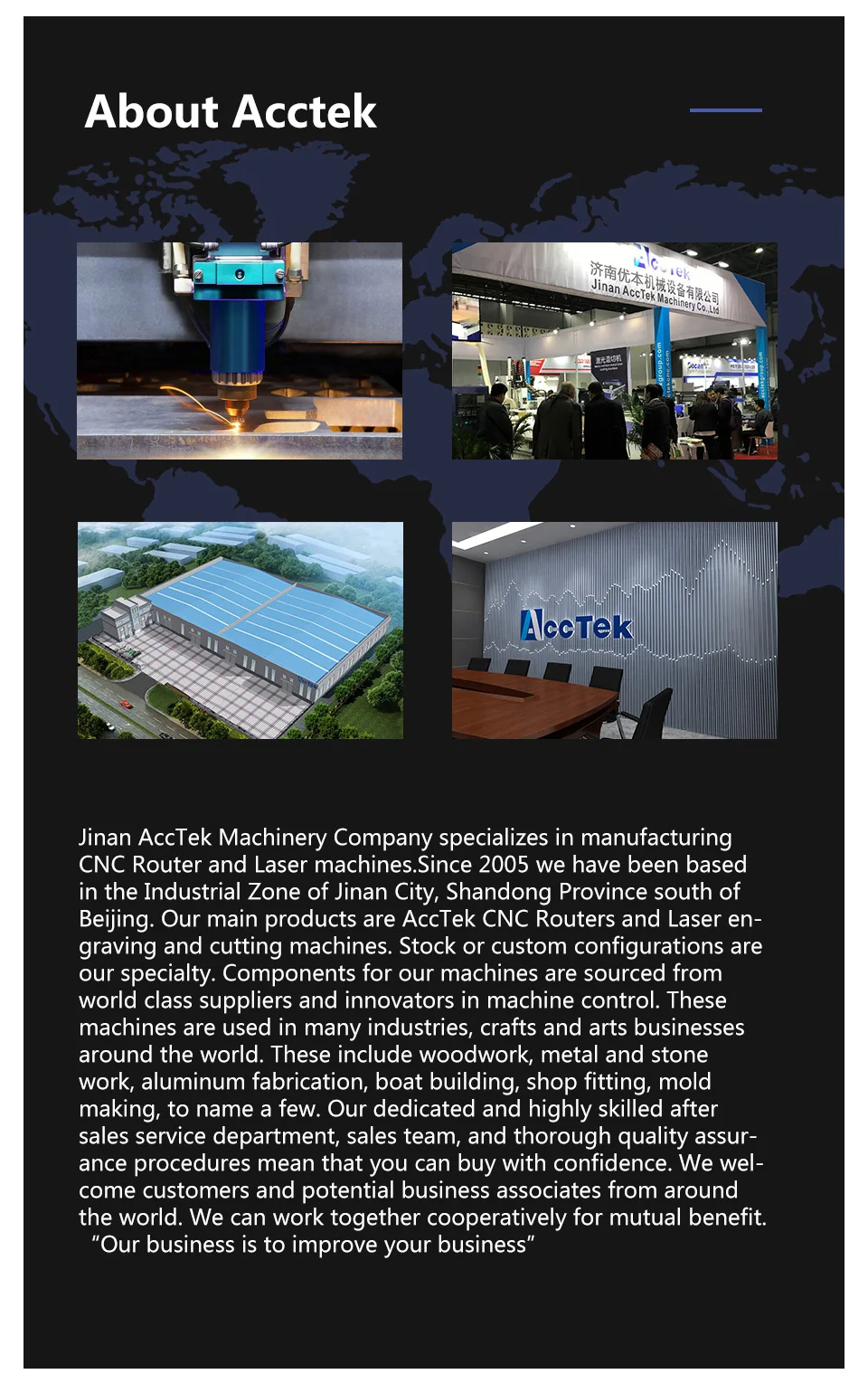 Jinan AccTek Machinery Co., Ltd находится в высокотехнологичной промышленной зоне Цзинань, которая специализируется на производстве чпу и лазерных машин с 2005 года.