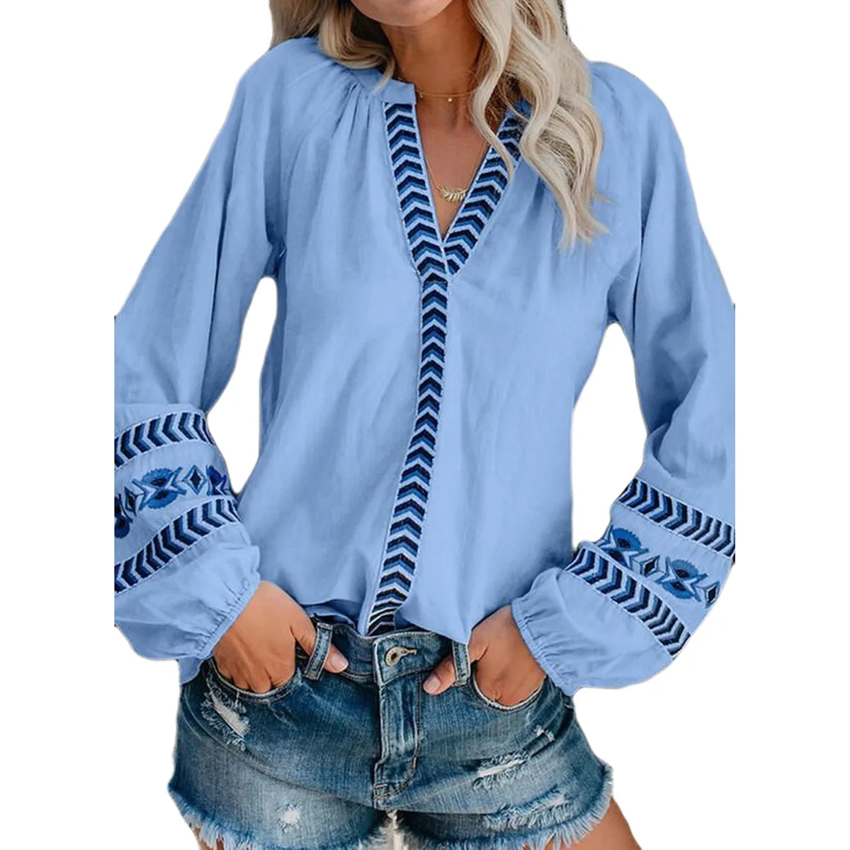 Женская Элегантная блузка, v-образный вырез, рукав-фонарик, полоски, Геометрическая отделка, Рубашки, Топы